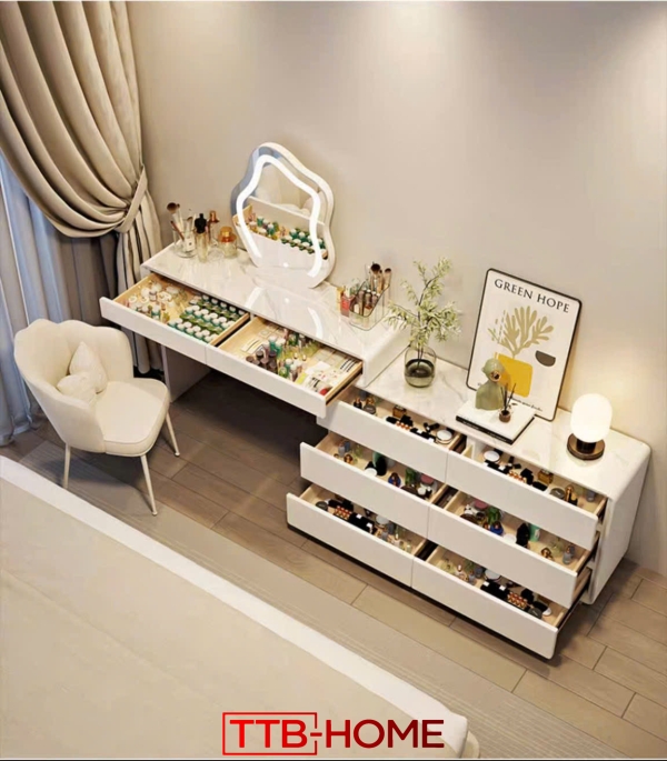 Ngăn kéo và hộc tủ được bố trí khoa học, giúp sắp xếp mỹ phẩm, phụ kiện gọn gàng. Kích thước linh hoạt đáp ứng nhu cầu sử dụng cá nhân và gia đình.