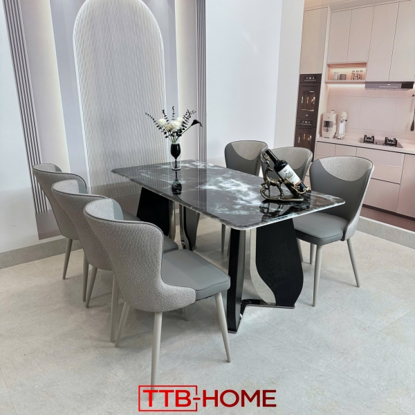 Bộ bàn ăn được thiết kế với sự kết hợp tinh tế giữa vật liệu cao cấp, mang đến vẻ đẹp hiện đại, sang trọng và độ bền vượt trội, đặc biệt phù hợp với các gia đình yêu thích sự đẳng cấp và có nuôi thú cưng.