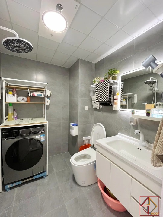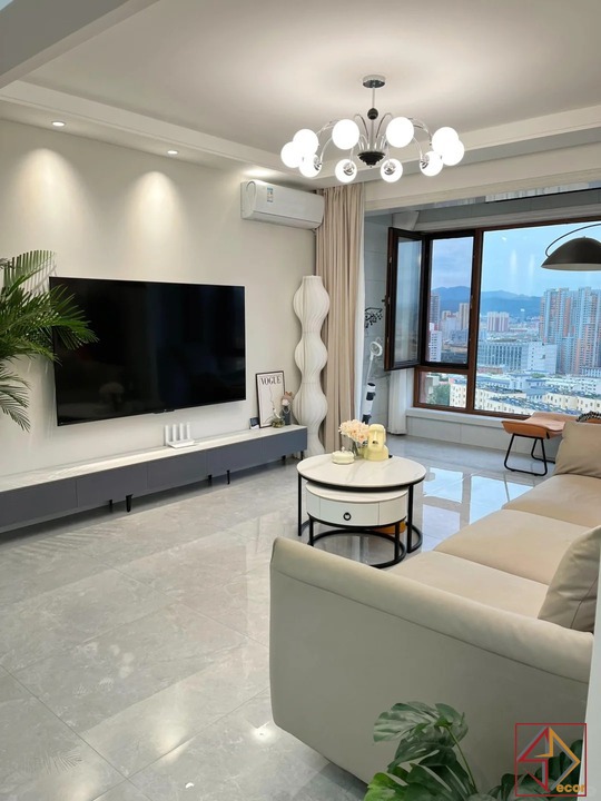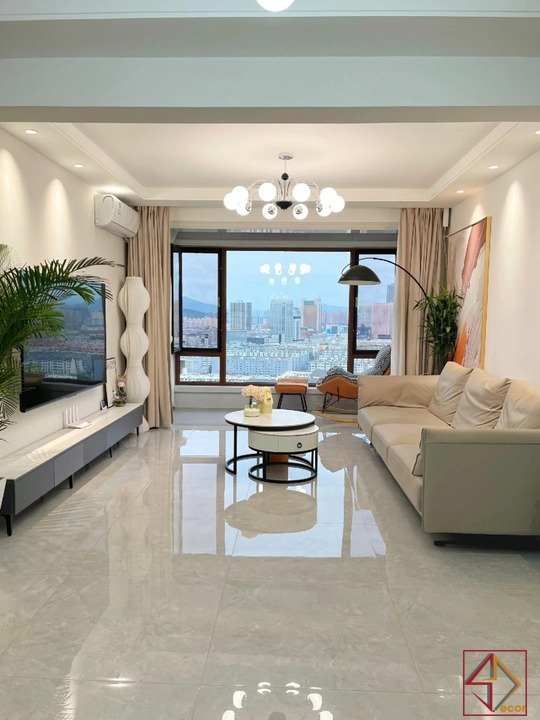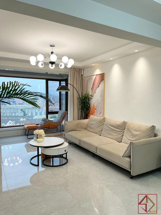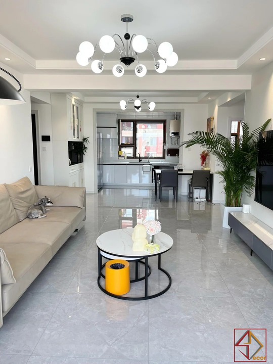2. Ánh Sáng Tự Nhiên và Nhân Tạo Đan XenTận dụng tối đa ánh sáng tự nhiên: Cửa sổ lớn từ phòng khách và phòng bếp giúp căn hộ luôn ngập tràn ánh sáng, mang lại năng lượng tích cực. TTBHOME đặc biệt chú trọng khu vực ban công nhỏ, biến nó thành nơi thư giãn lý tưởng với chiếc ghế đơn êm ái, tận hưởng view thành phố. Hệ thống đèn hiện đại: Đèn chùm quả cầu độc đáo ở phòng khách và phòng bếp, kết hợp đèn âm trần, đèn sàn (floor lamp) tạo ra nhiều lớp ánh sáng, không chỉ chiếu sáng mà còn là vật trang trí ấn tượng, tăng tính thẩm mỹ cao. II. Tối Ưu Công Năng Qua Từng Khu VựcMỗi không gian trong căn hộ Diamond Centery đều được TTBHOME tính toán kỹ lưỡng, đảm bảo tính thẩm mỹ đi đôi với công năng sử dụng tối ưu cho gia đình: 1. Phòng Khách: Thoáng Đãng và Sang Trọng (SEO Keywords: Thiết kế phòng khách chung cư hiện đại, Sofa phòng khách chung cư, Tủ TV hiện đại)