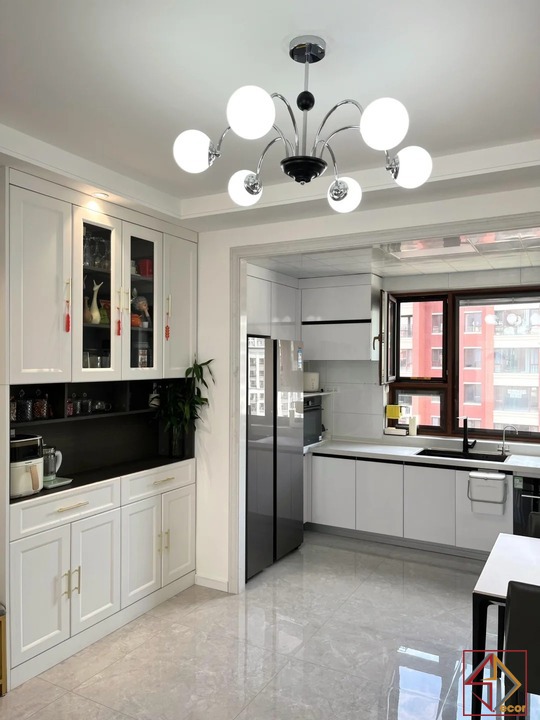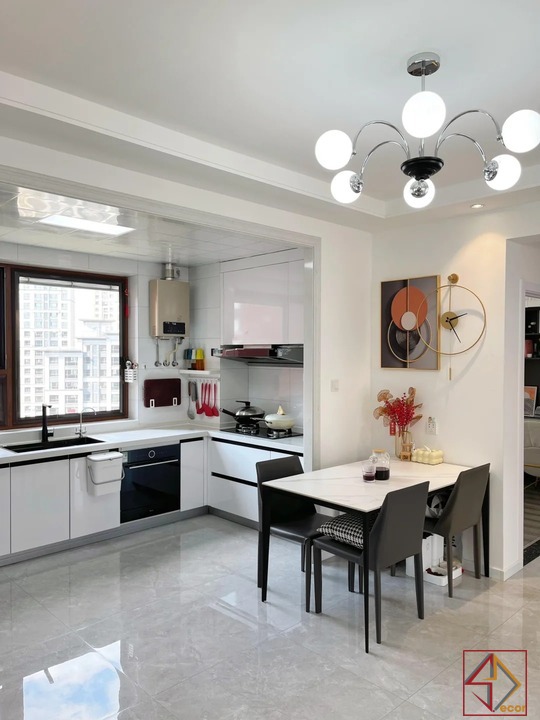 2. Khu Vực Bếp – Ăn: Tiện Nghi và Sạch Sẽ (SEO Keywords: Thiết kế bếp chung cư chữ L, Tủ bếp chung cư hiện đại, Bàn ăn chung cư)