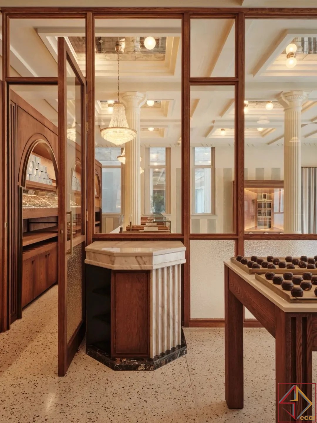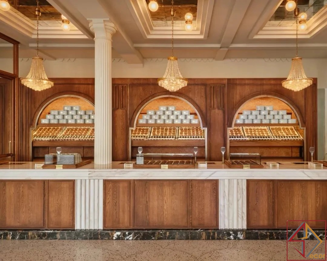 Điểm Nhấn Đồng/Vàng: Các điểm nhấn kim loại tinh tế, có thể là đồng hoặc vàng, có thể được nhìn thấy trong các thiết bị chiếu sáng và có thể là một số yếu tố trưng bày, tăng thêm cảm giác sang trọng.