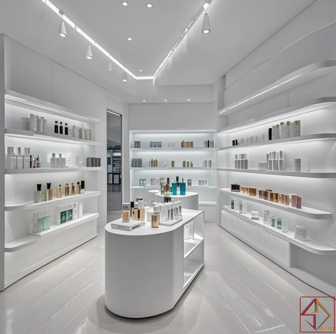Điểm nhấn từ vật liệu: Trong một số khu vực, việc sử dụng gỗ nhạt màu cho quầy kệ hoặc sàn trung tâm mang lại sự ấm áp, cân bằng lại sự “lạnh” của màu trắng, tạo cảm giác gần gũi và tự nhiên.