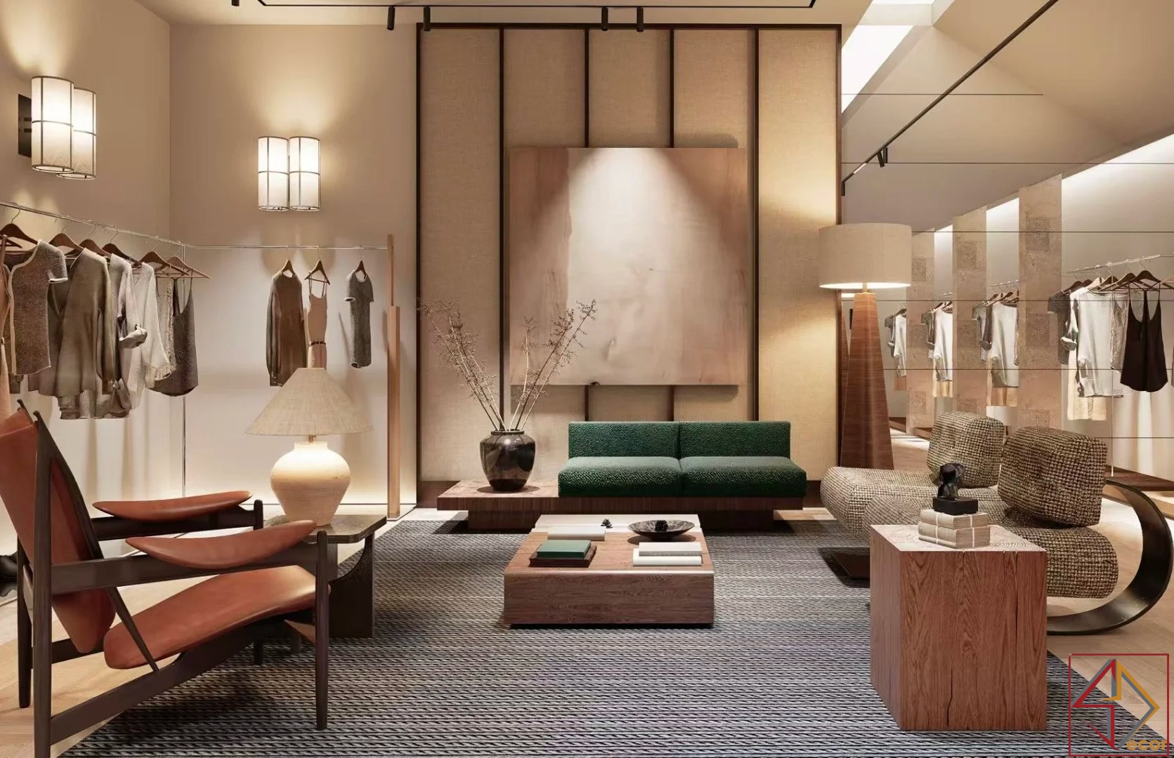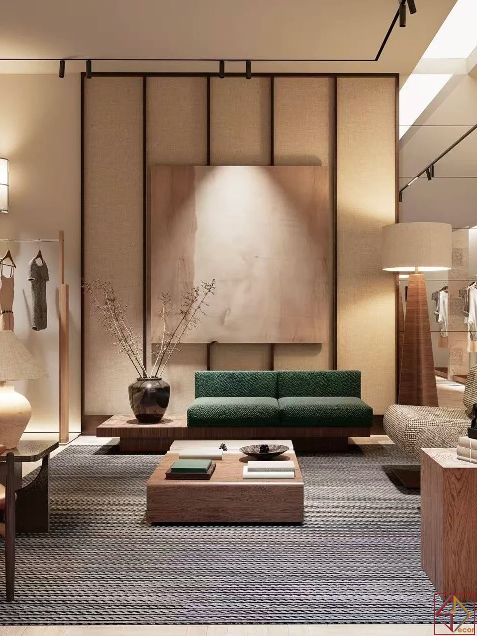 Không gian trải nghiệm cao cấp: Bố trí sofa, ghế bành và bàn cà phê, tạo không gian thư giãn, thoải mái cho khách hàng. Tích hợp tranh lớn và vật dụng trang trí độc đáo, nâng tầm thẩm mỹ không gian.