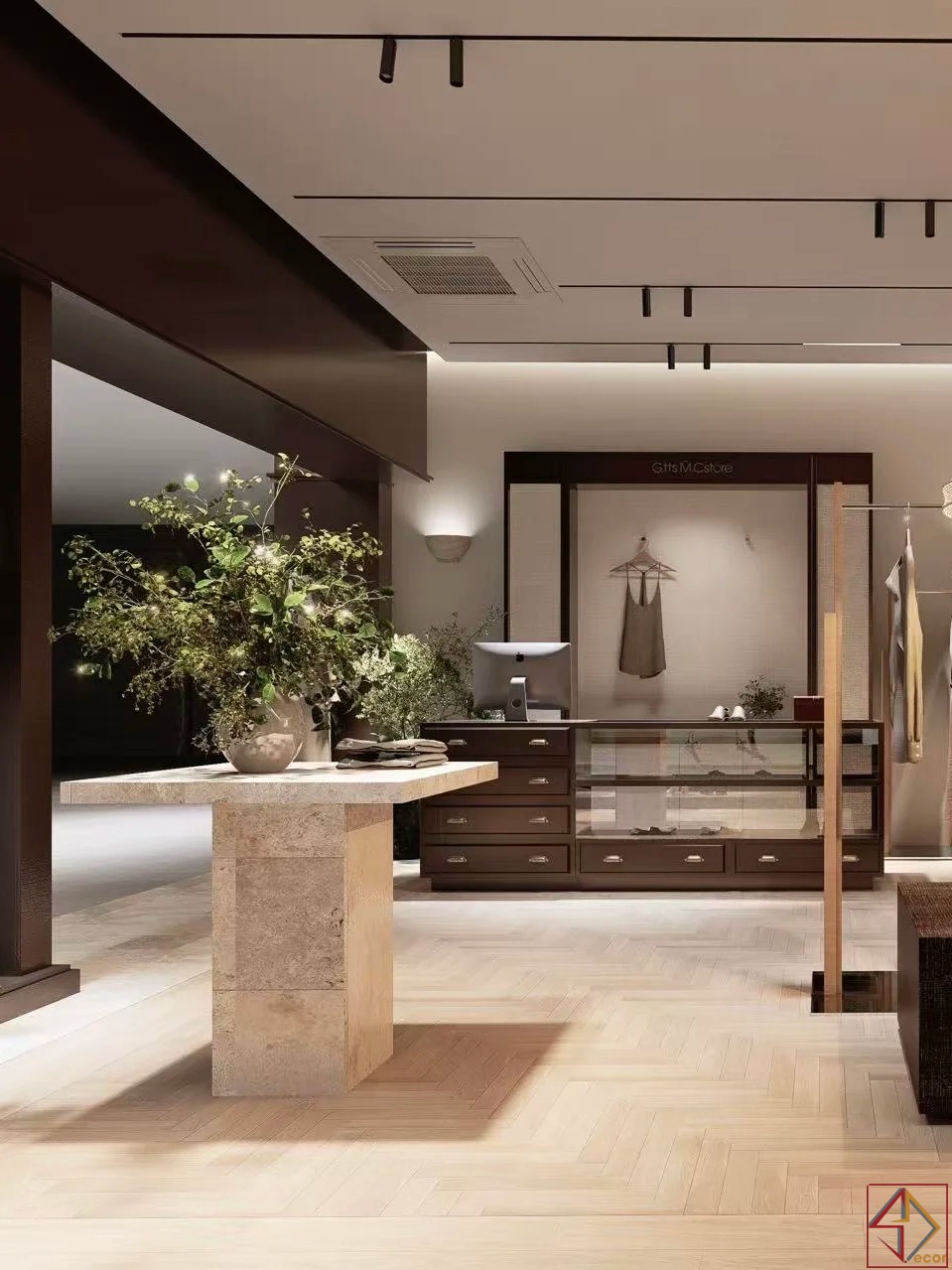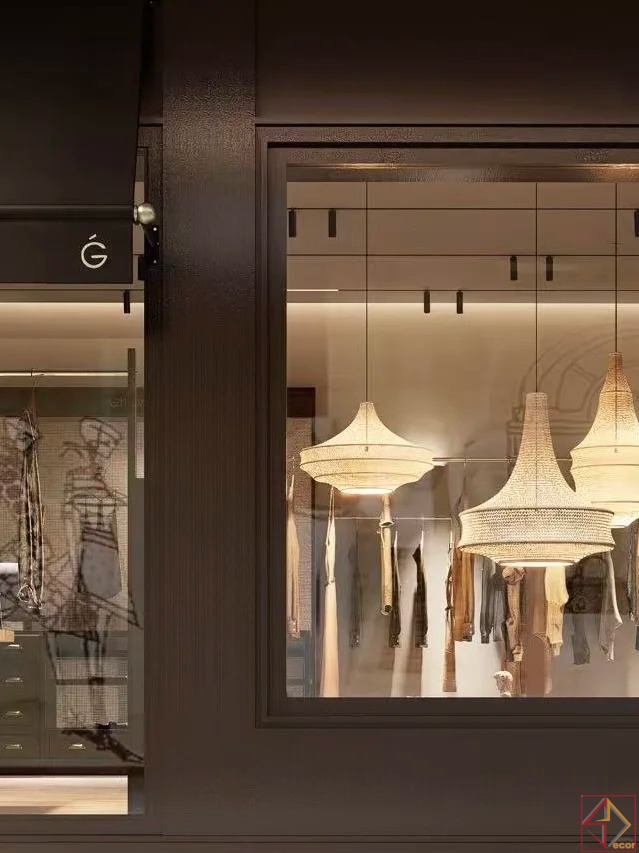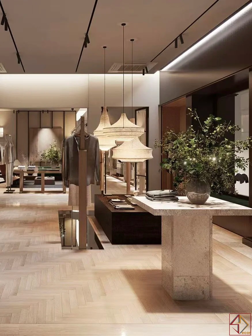 Hệ thống chiếu sáng thông minh: Đèn rọi ray chiếu sáng linh hoạt, làm nổi bật sản phẩm và các khu vực trưng bày. Đèn hắt tường và đèn thả trang trí tạo ánh sáng gián tiếp mềm mại, tăng cường không khí sang trọng và thu hút. Ánh sáng tích hợp làm sáng các kệ trưng bày, tôn vinh từng sản phẩm.
