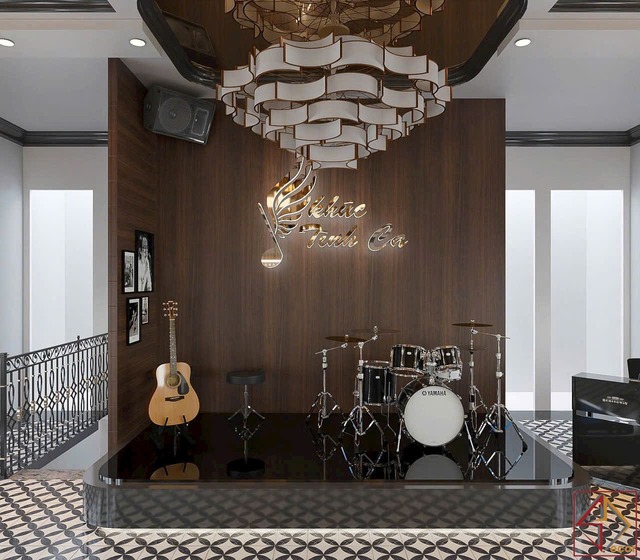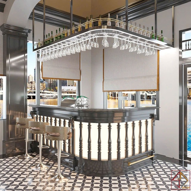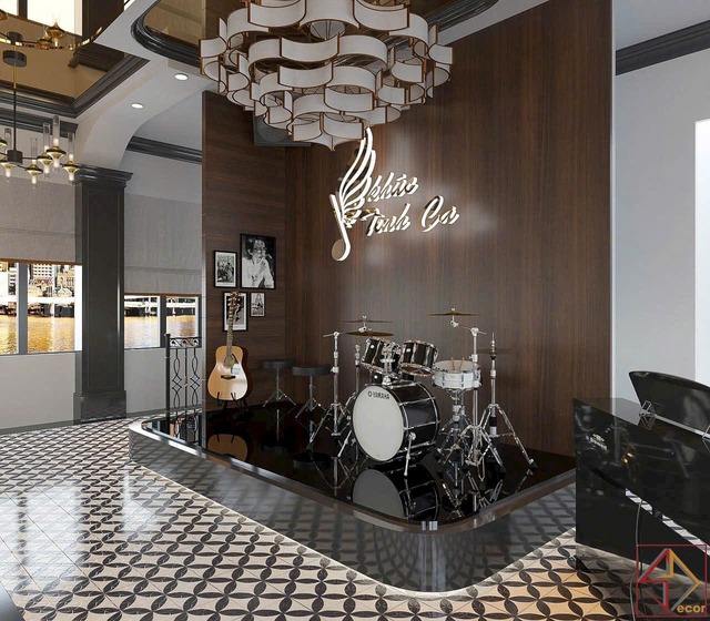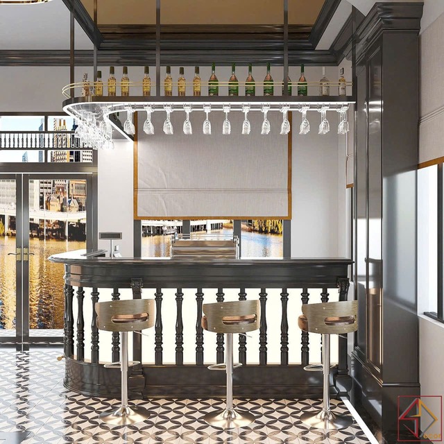 Cách bài trí nội thất: Bố cục đối xứng và rõ ràng. Quầy bar là điểm nhấn quan trọng, được thiết kế tỉ mỉ với vật liệu cao cấp và trưng bày hấp dẫn. Khu vực sân khấu nhỏ có thể có khu vực riêng cho biểu diễn nhạc sống tạo thêm trải nghiệm giải trí.