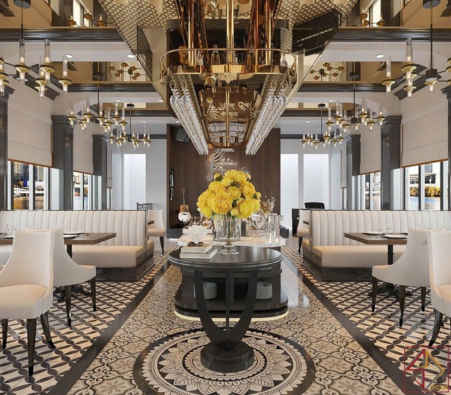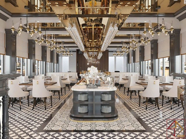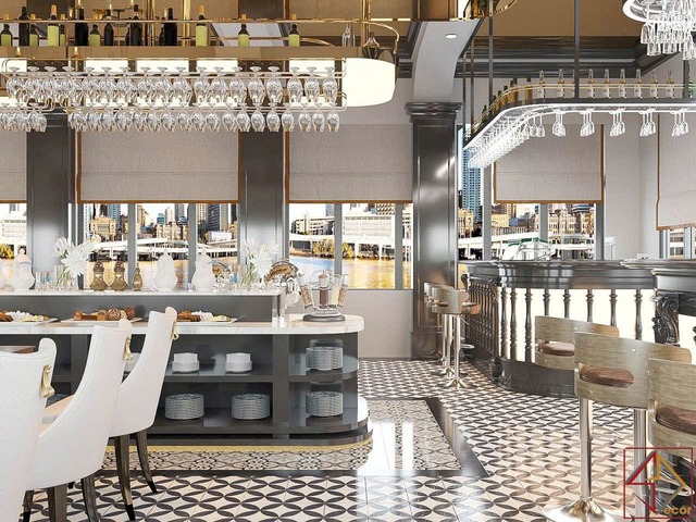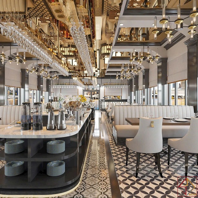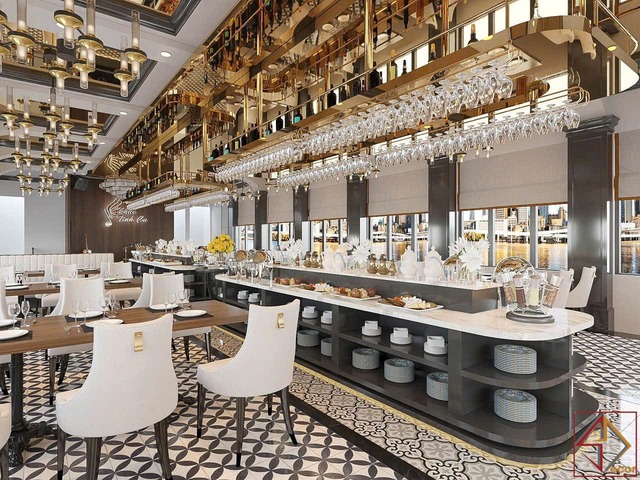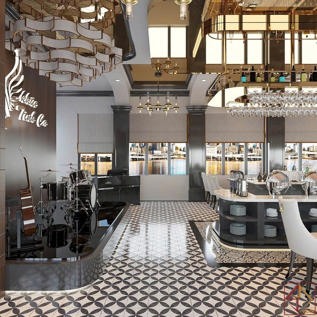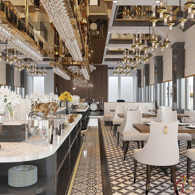 Cách sử dụng vật liệu và màu sắc: Kim loại vàng đồng là điểm nhấn vật liệu quan trọng, xuất hiện ở khung trần, đèn, tay vịn, viền đồ nội thất, tạo vẻ xa hoa, lấp lánh và đẳng cấp. Bề mặt quầy bar, bàn phục vụ trung tâm thường sử dụng đá cẩm thạch trắng với vân tự nhiên, mang lại sự tinh khiết, sang trọng và hiện đại.
