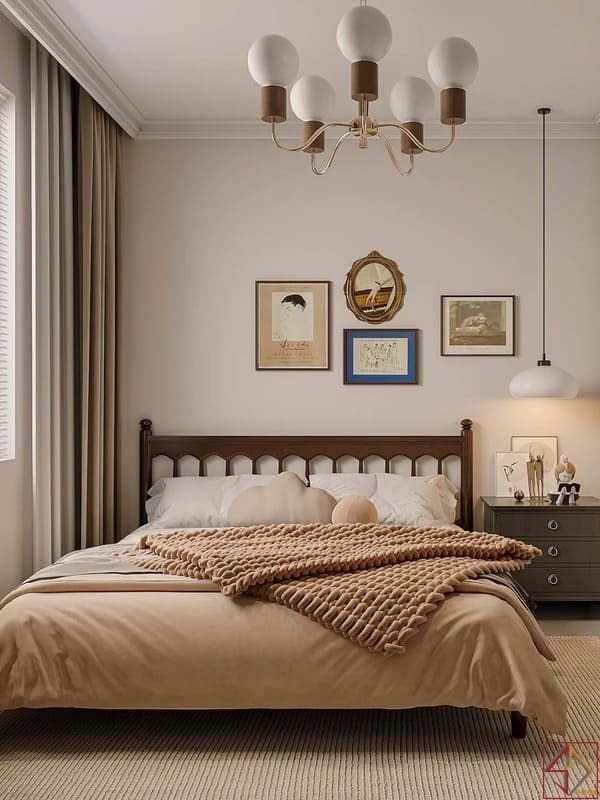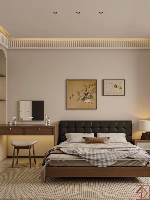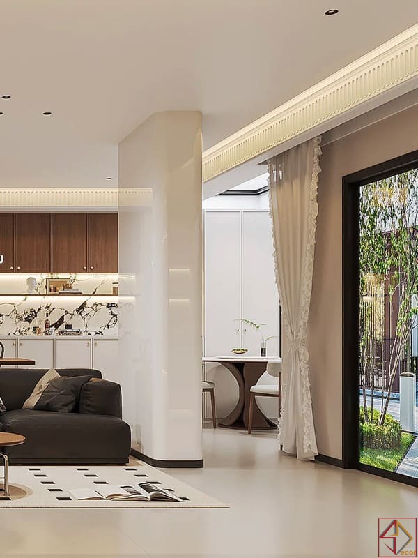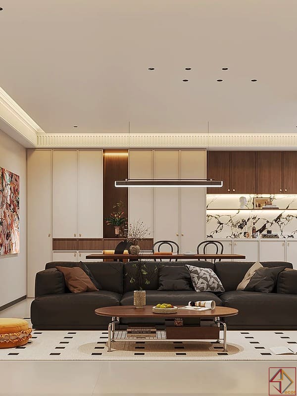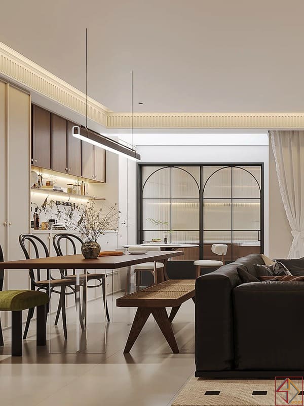 3. Nét nghệ thuật tinh tế: Các chi tiết trang trí như phào chỉ trần nhà, đèn treo hay tranh ảnh được lựa chọn cẩn thận, tạo điểm nhấn cá tính và nghệ thuật cho không gian, không gây cảm giác đơn điệu.