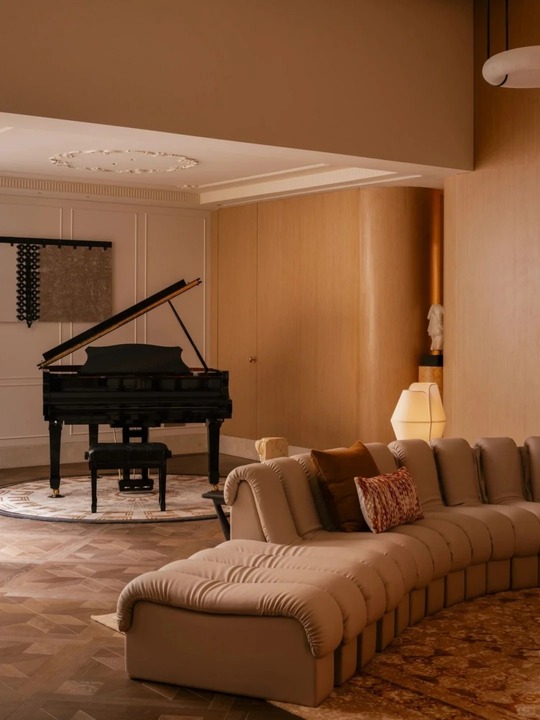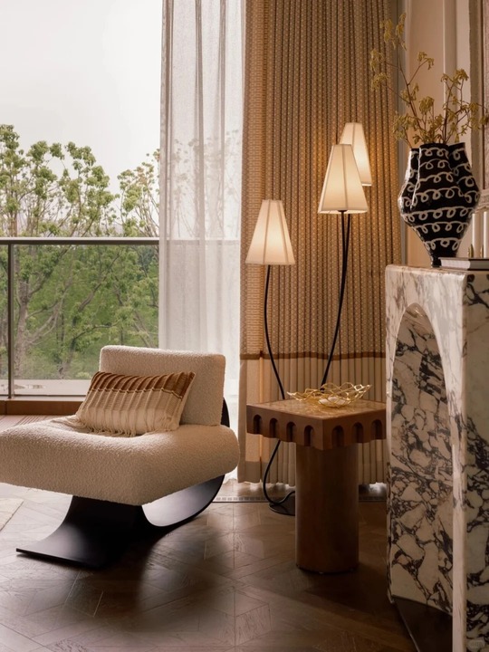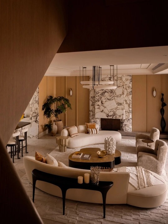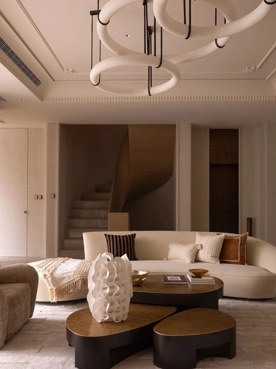 Khác biệt hoàn toàn với sự góc cạnh thường thấy của Hiện đại, không gian này sử dụng nội thất với đường cong (curvy furniture) làm chủ đạo: