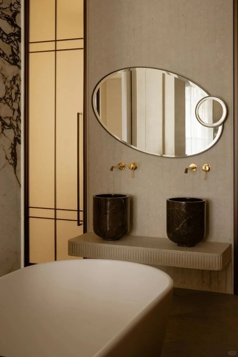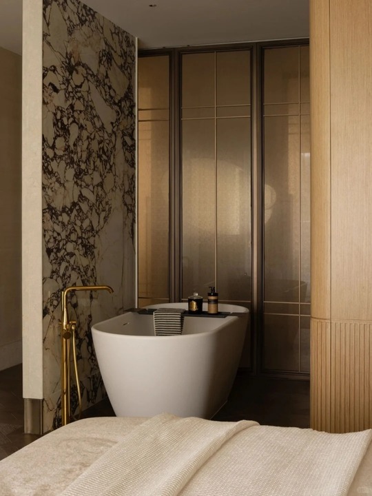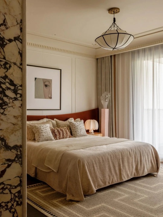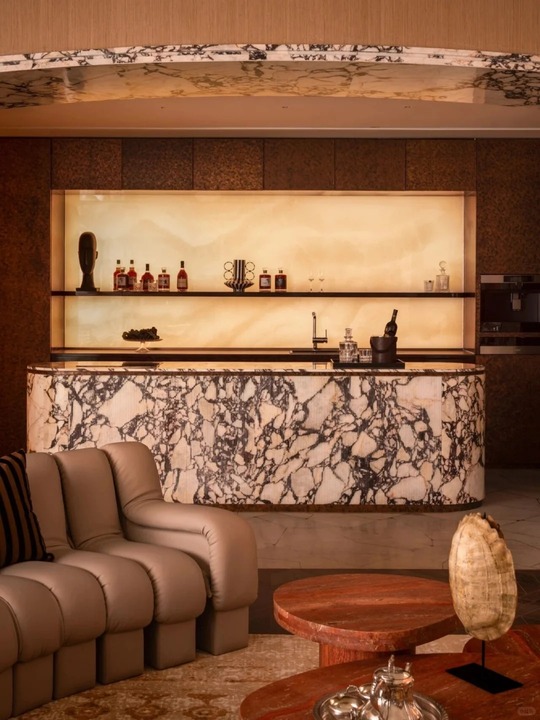 - Chất Liệu Cao Cấp: Đá Marble với những đường vân ấn tượng được sử dụng cho vách trang trí (lò sưởi, phòng tắm, quầy bar) và mặt bàn.