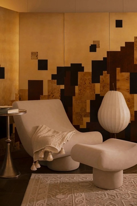 - Sofa cong, bàn trà hình hạt đậu (pebble-shaped) và ghế thư giãn Lounge Chair mang đậm dấu ấn thập niên 60-70.