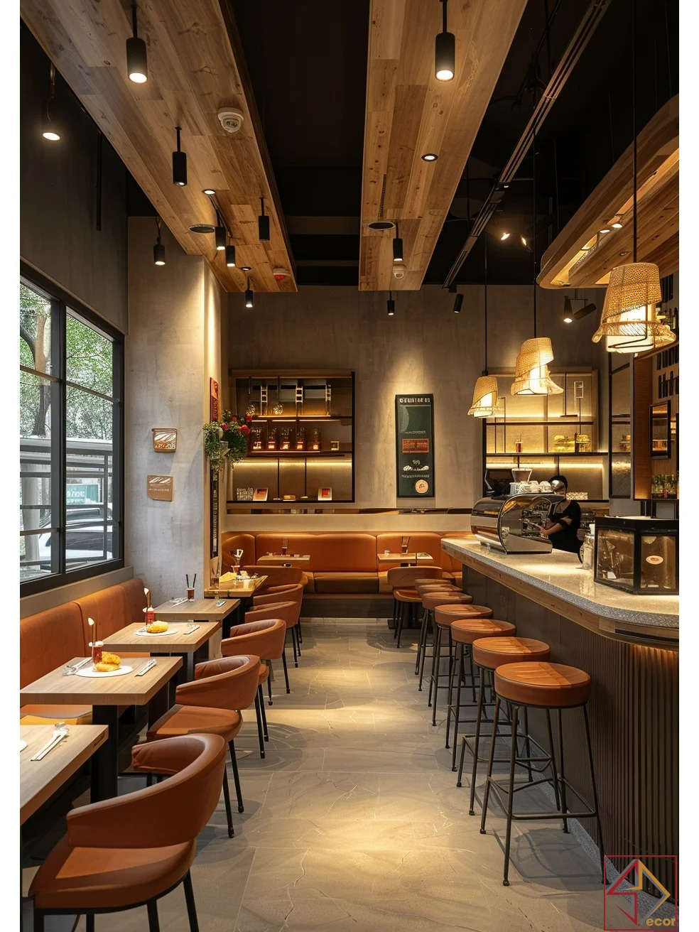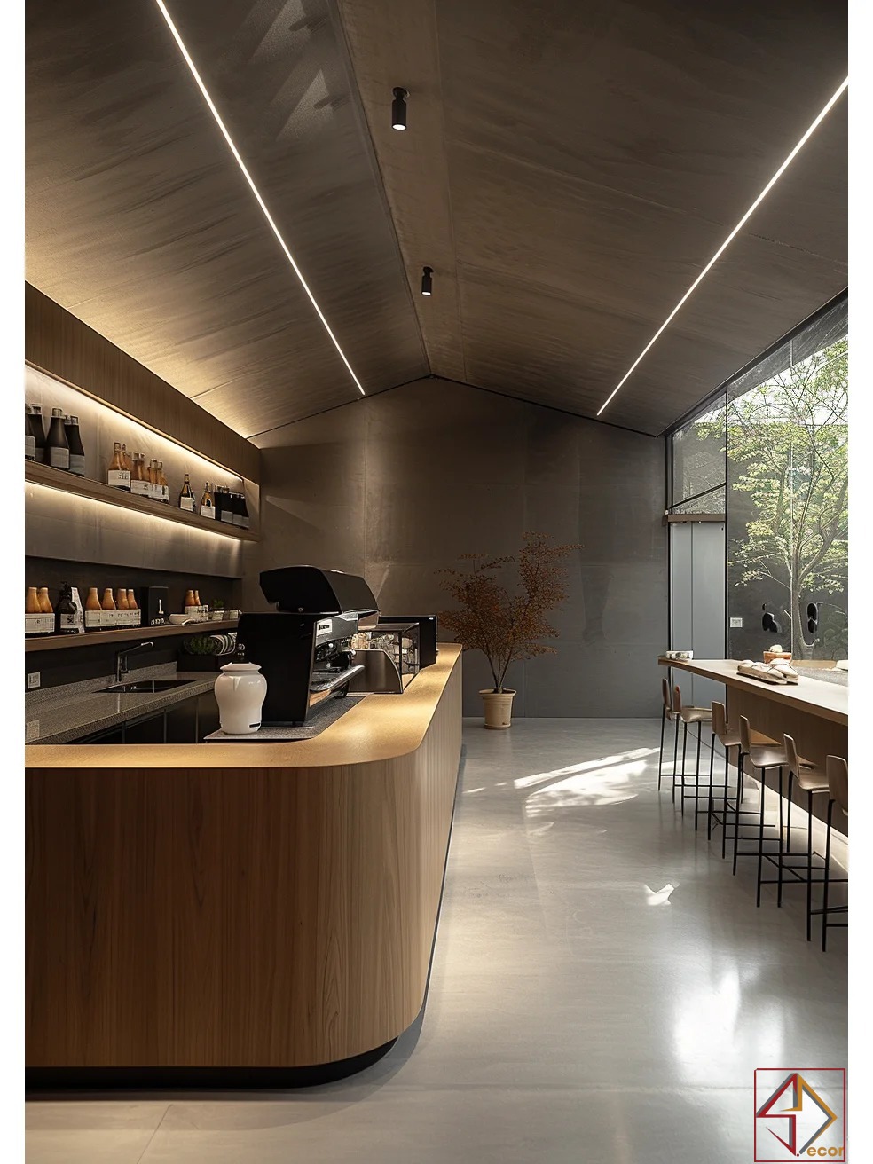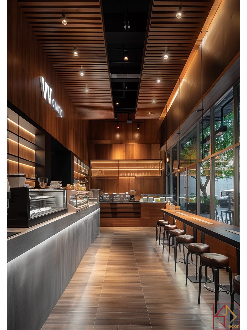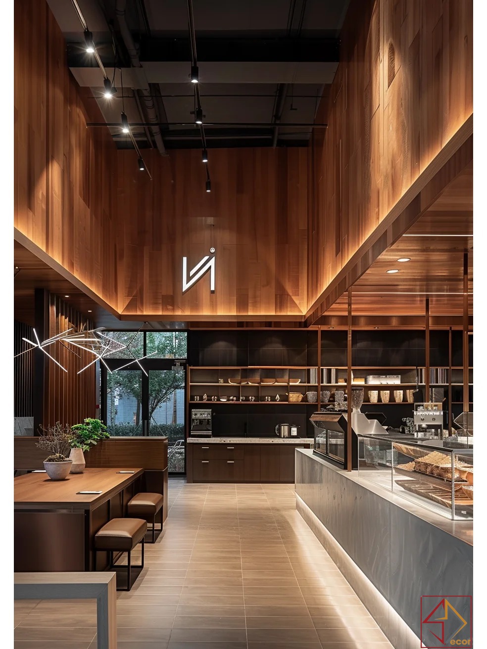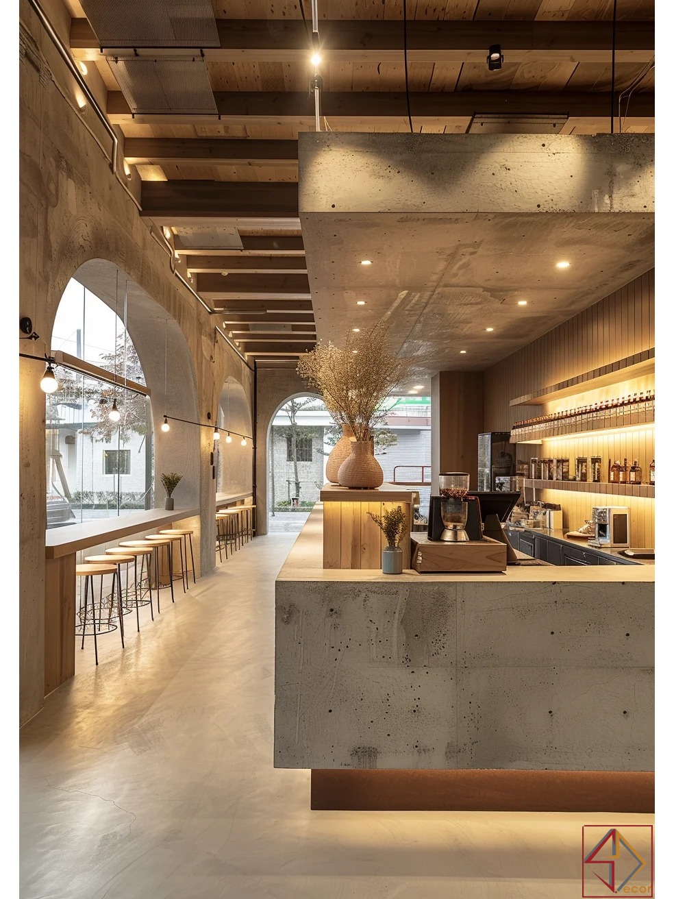 Vật liệu tự nhiên: Gỗ (ốp tường, trần, quầy, bàn ghế) là chủ đạo, kết hợp bê tông, đá và kim loại đen, tạo sự ấm áp, mộc mạc và hiện đại.