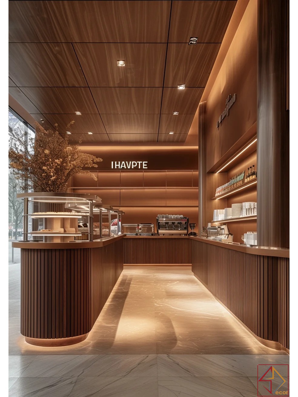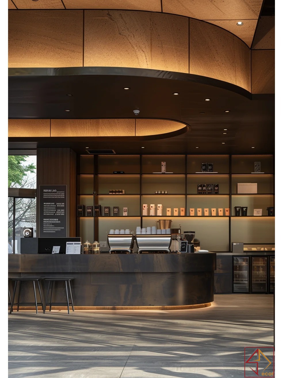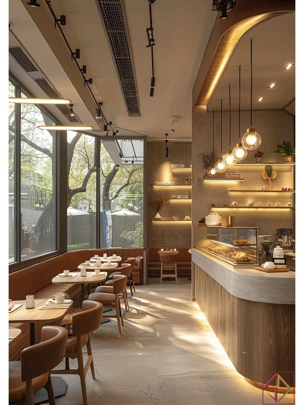 Ánh sáng tinh tế: Tối ưu ánh sáng tự nhiên qua kính lớn. Đèn LED hắt sáng (dưới quầy, trần cong) tạo hiệu ứng nổi bật và không khí ấm cúng; đèn spotlight cung cấp ánh sáng chức năng.