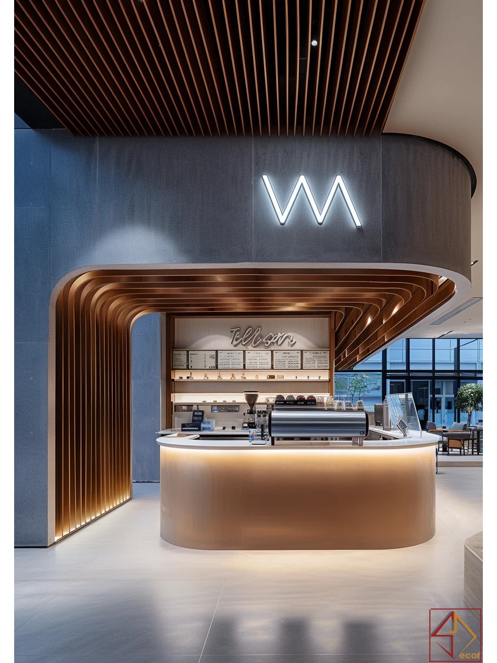 Đường nét mềm mại: Đường cong uốn lượn (quầy bar, trần, các chi tiết nội thất) làm mềm không gian, tạo cảm giác thân thiện và thanh thoát, cân bằng với các đường thẳng tối giản.