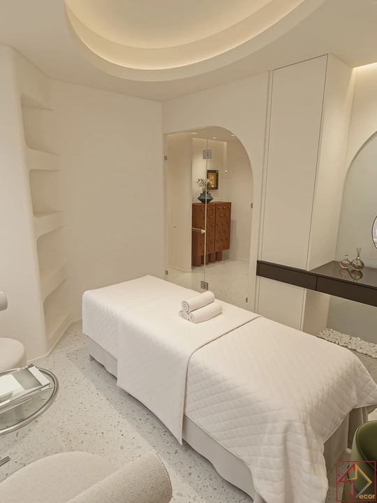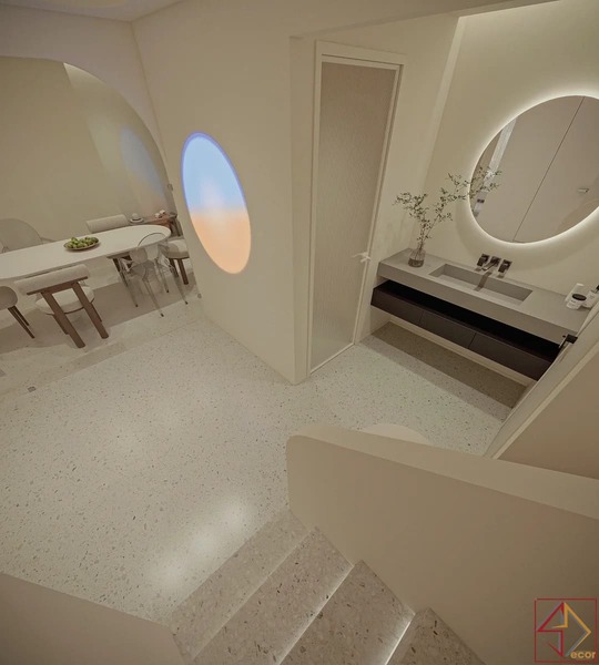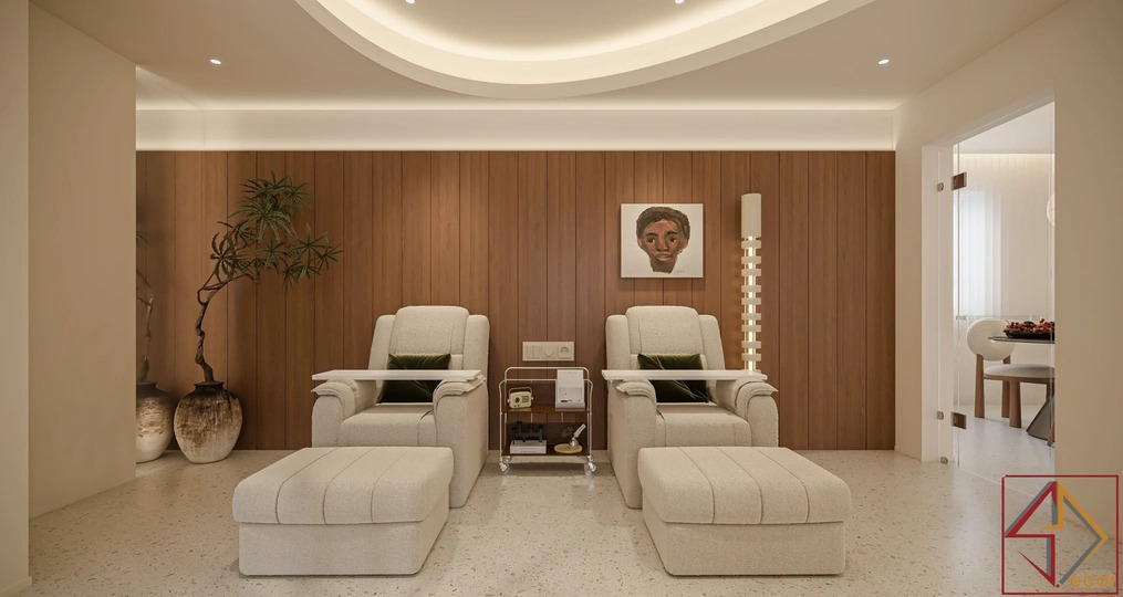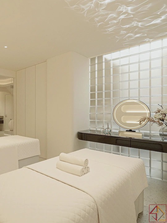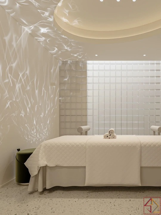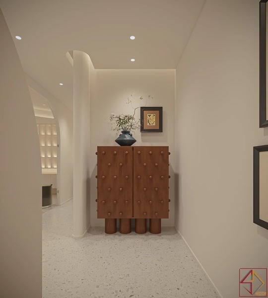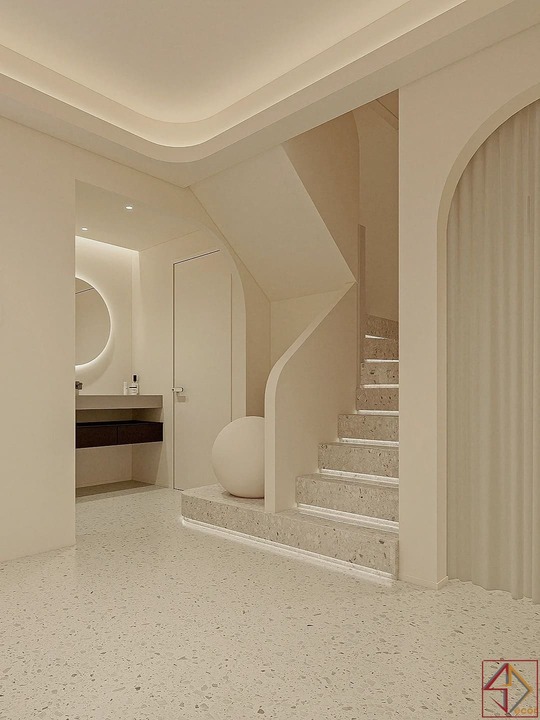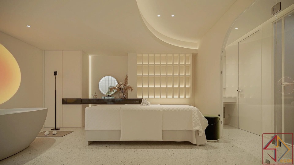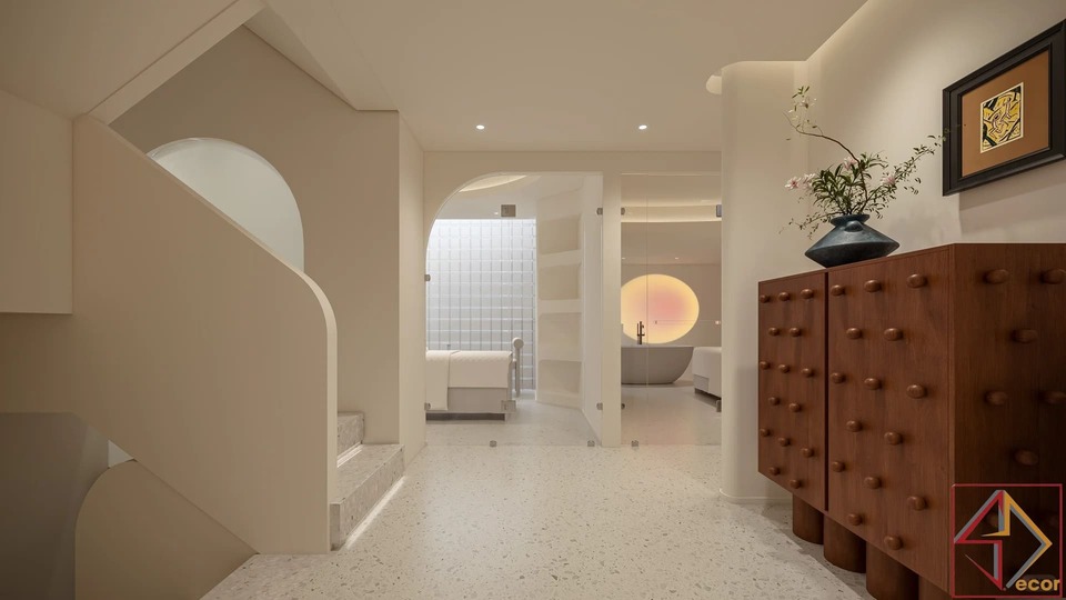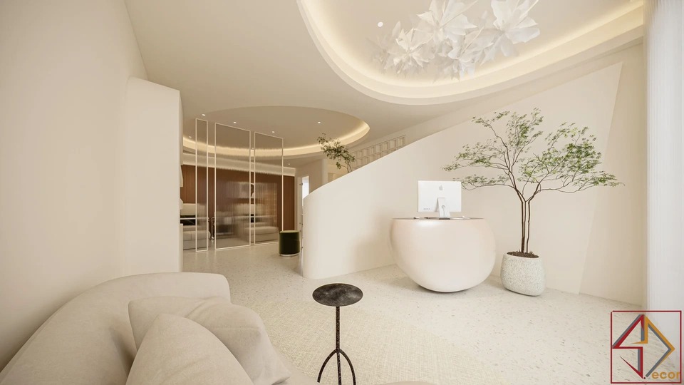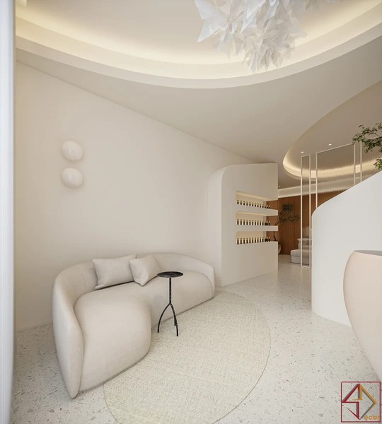 Trần nhà điêu khắc: Đây là điểm nhấn kiến trúc nổi bật và độc đáo nhất. Trần nhà không phẳng mà được tạo hình bằng các khối đa giác 3D, lồi lõm, hoặc các panel hình học phức tạp, tạo nên một “bầu trời” có kết cấu và chiều sâu đáng kinh ngạc.