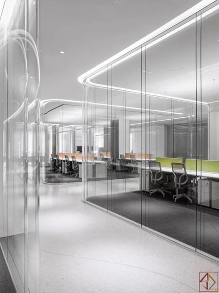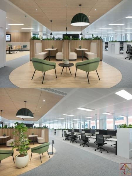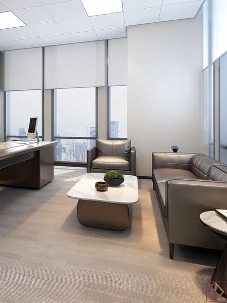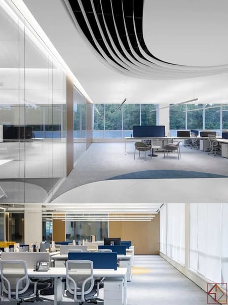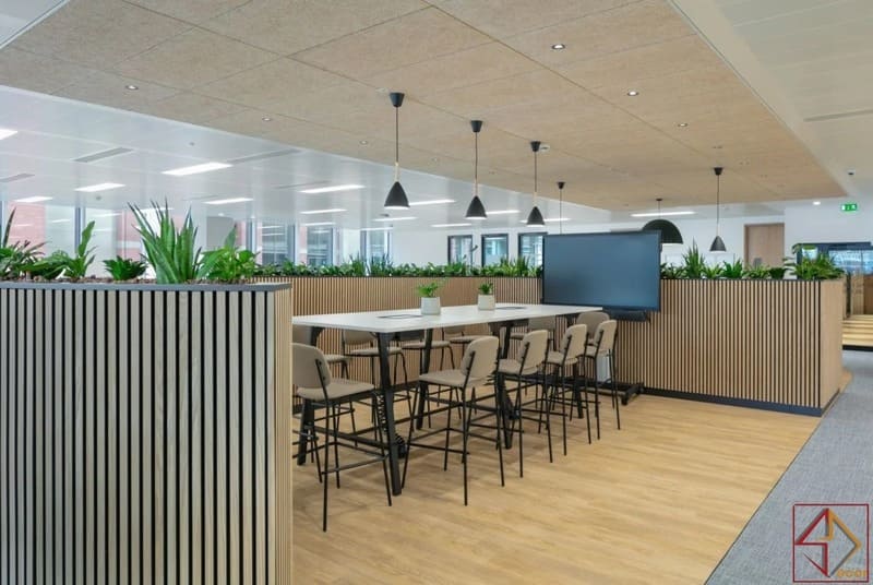 Không gian mở – kết nối dễ dàng trong công việc :Văn phòng sử dụng bố cục mở, tạo cảm giác rộng rãi và thoáng đãng.Nhân viên dễ dàng di chuyển và giao tiếp hàng ngày.Trần nhà và sàn gạch phân chia khu chức năng hợp lý.Không gian mở giúp tăng sự kết nối giữa các bộ phận.