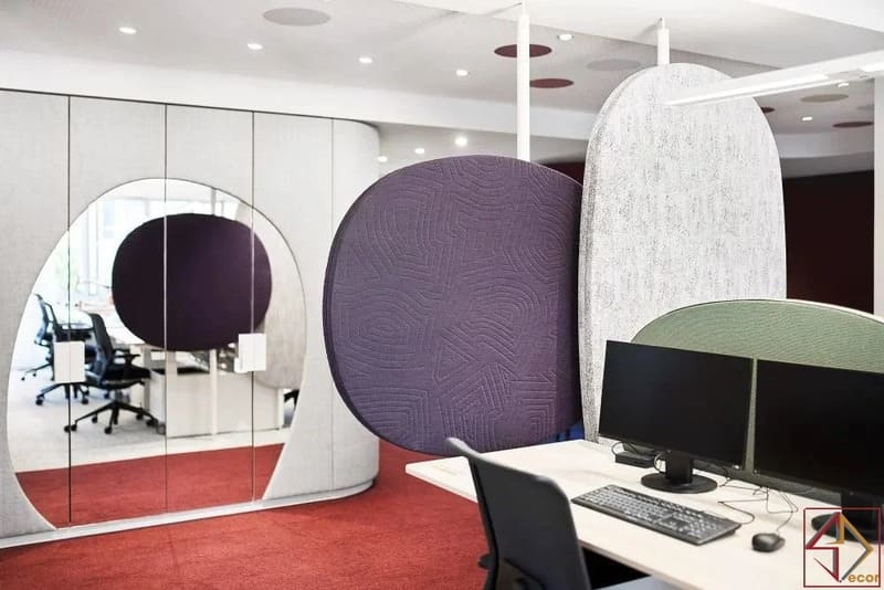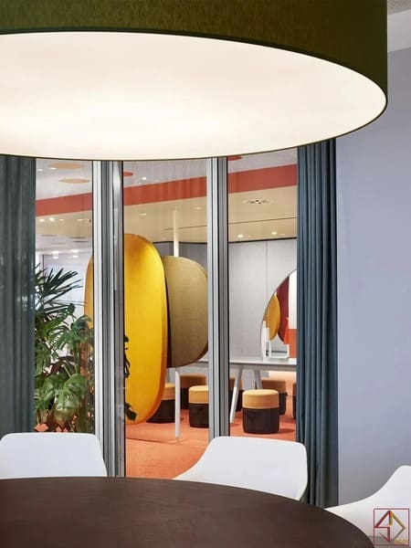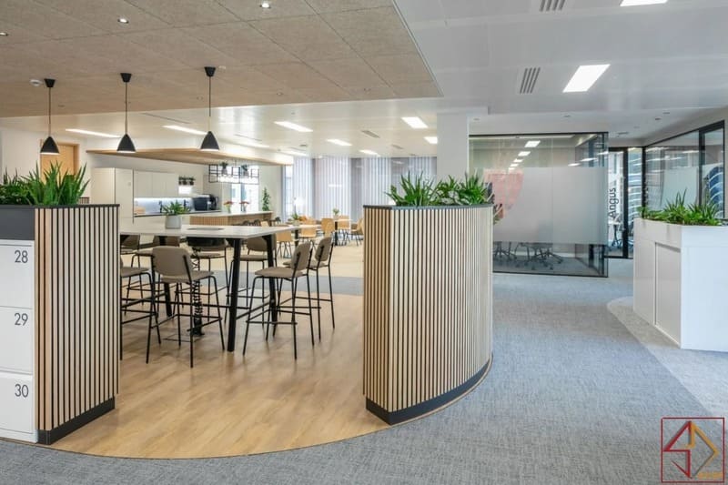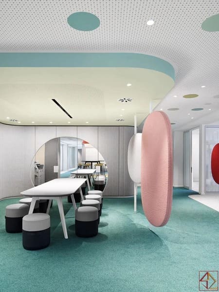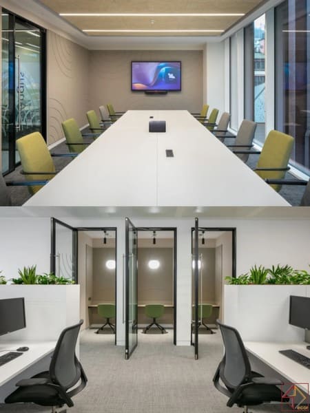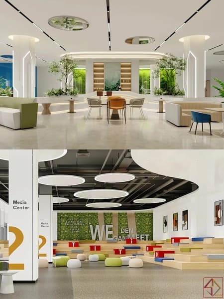 Thiết kế linh hoạt – đáp ứng mọi nhu cầu làm việcLối vào có ghế ngồi thoải mái và cây xanh lọc không khí. Khu thư giãn bố trí bếp nhỏ, quầy cà phê và sofa quầy bar.Bàn làm việc mở cho nhóm, cộng tác trung tâm giúp trao đổi nhanh. Ba cabin cách âm và ba phòng họp đáp ứng nhu cầu đa dạng.