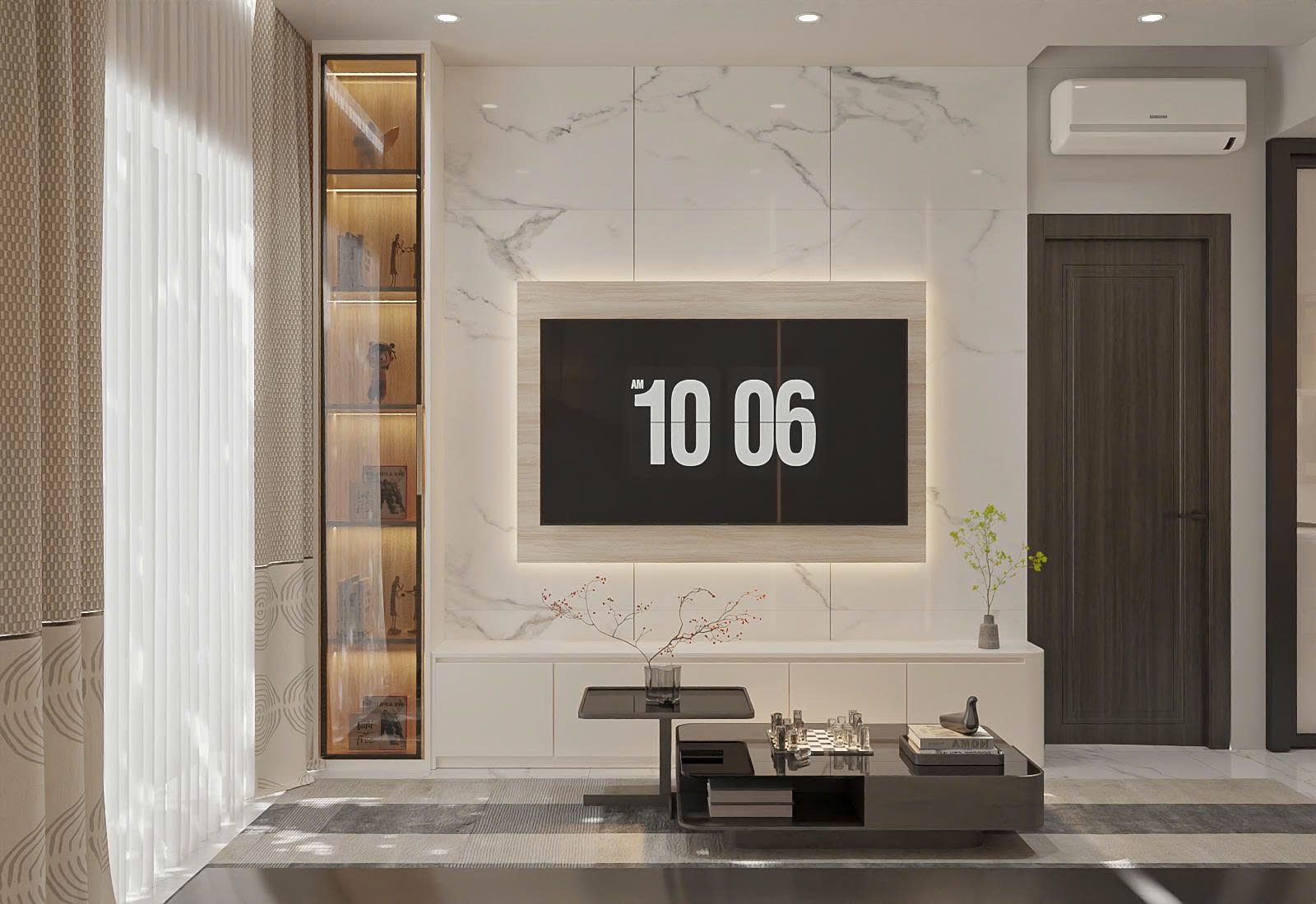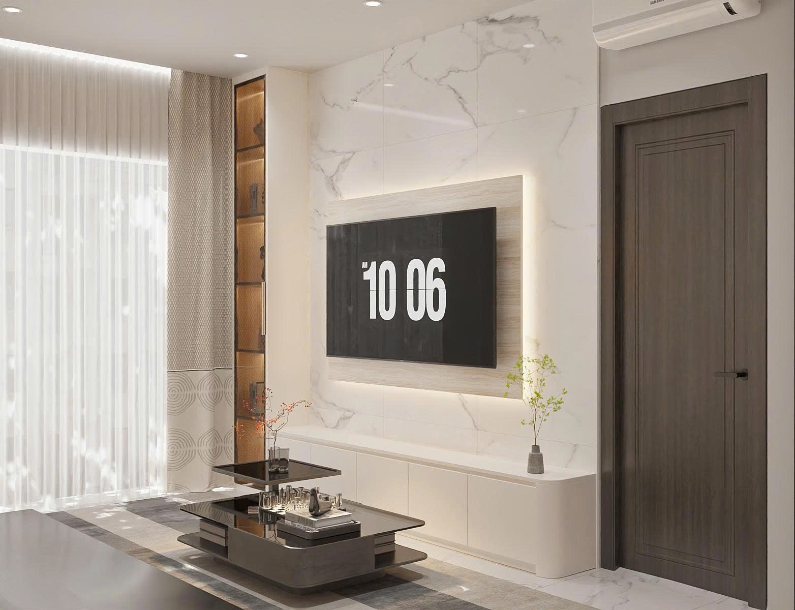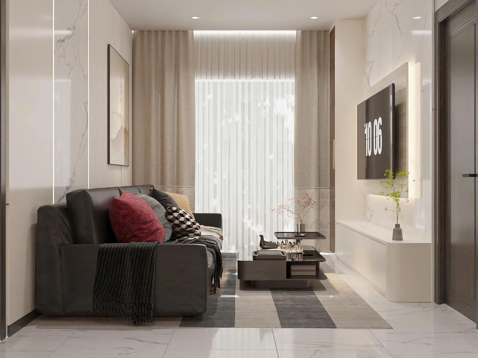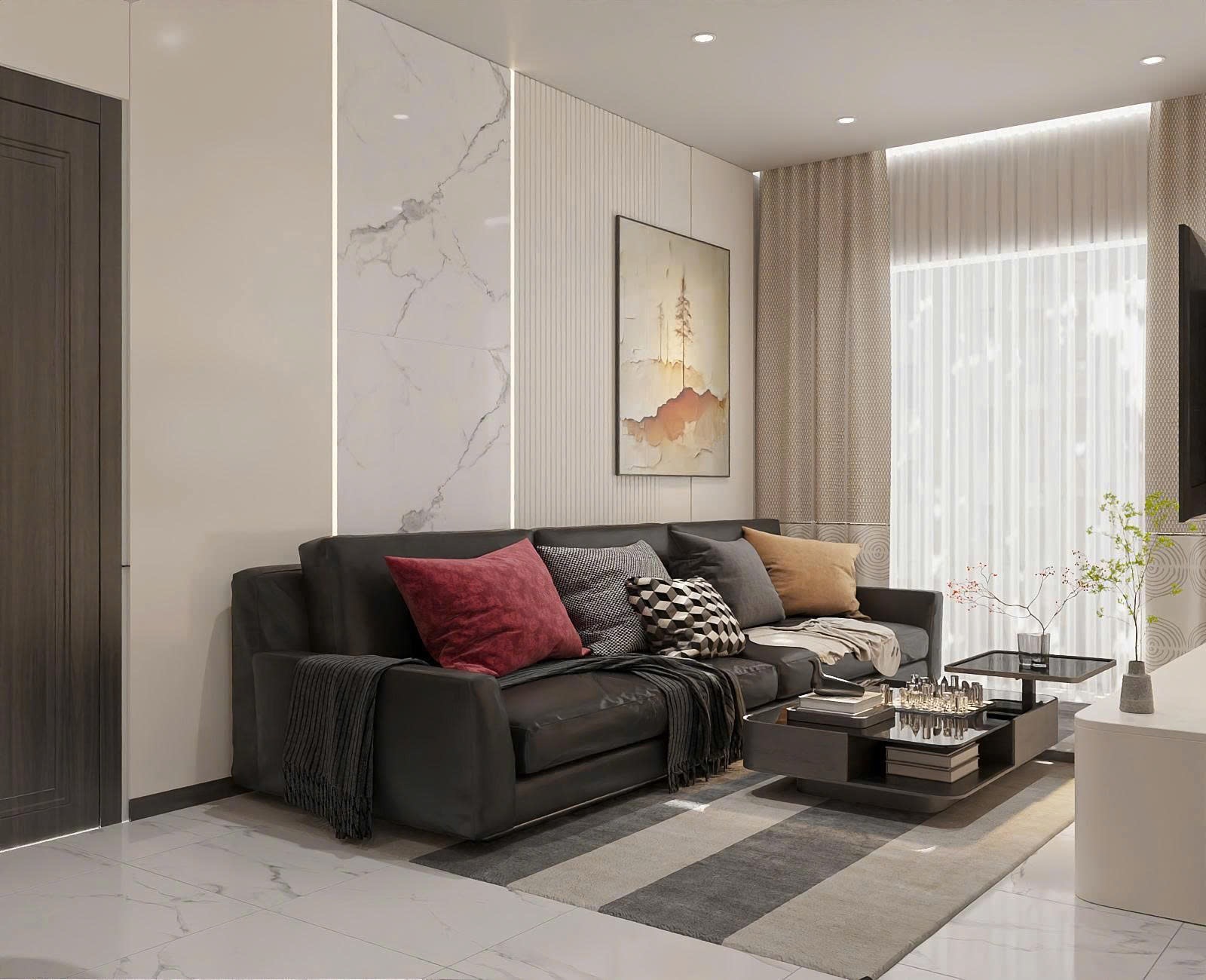 Phòng khách được TTB Home thiết kế theo phong cách Minimalism (Tối giản). Bộ sofa nỉ cao cấp với kích thước vừa vặn được đặt sát tường. Điểm nhấn là hệ vách ốp đá kết hợp đèn LED hắt sáng, tạo cảm giác sang trọng mà không rườm rà.