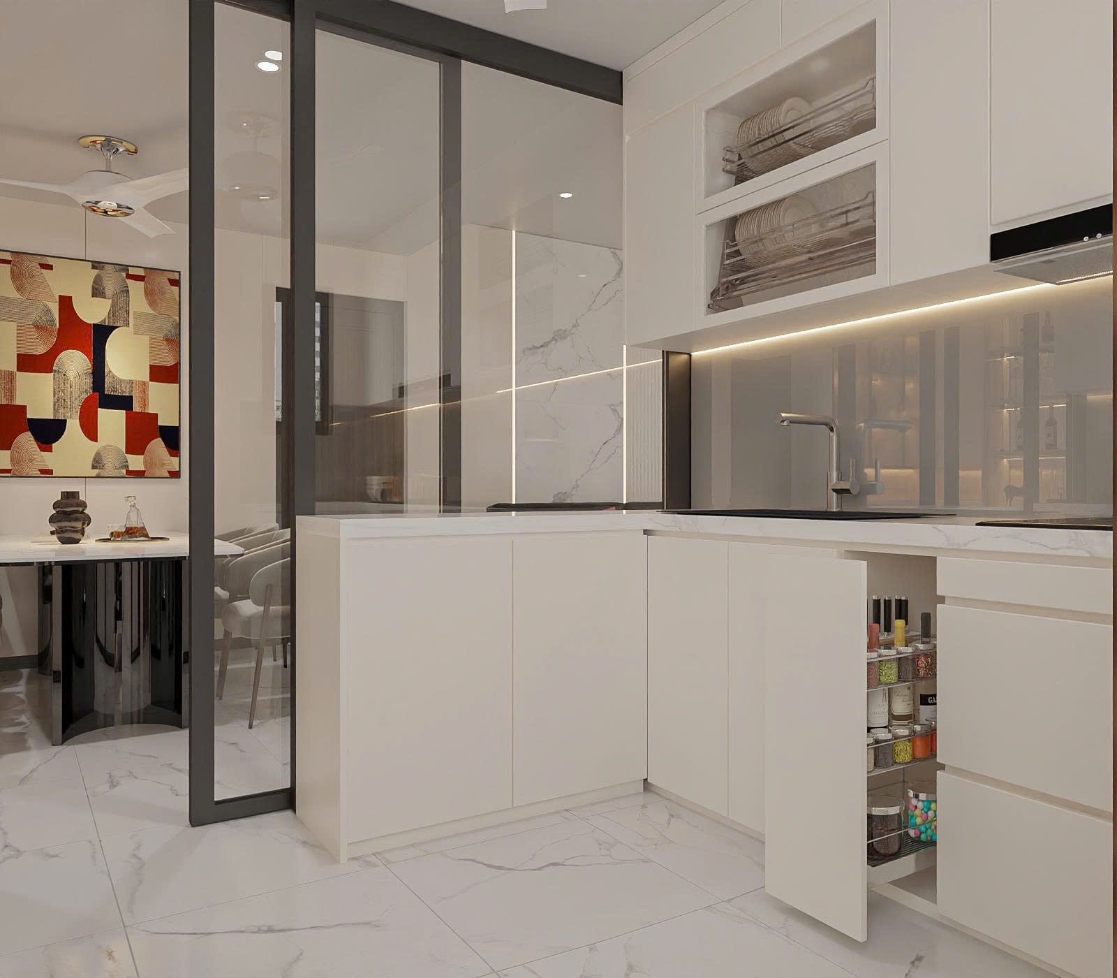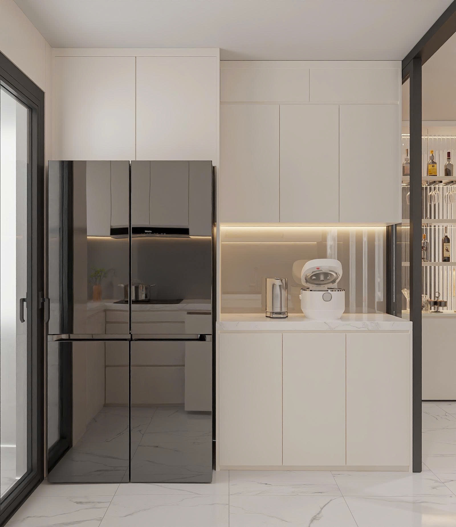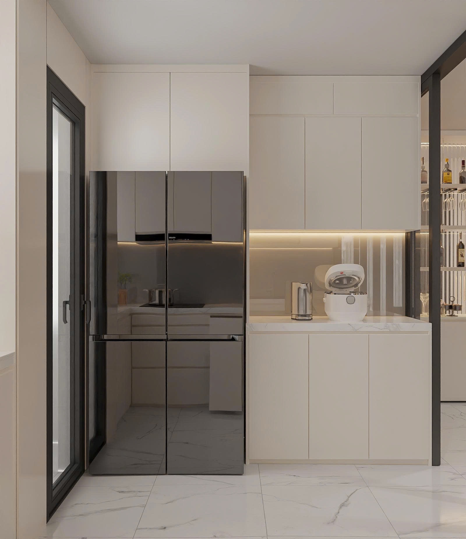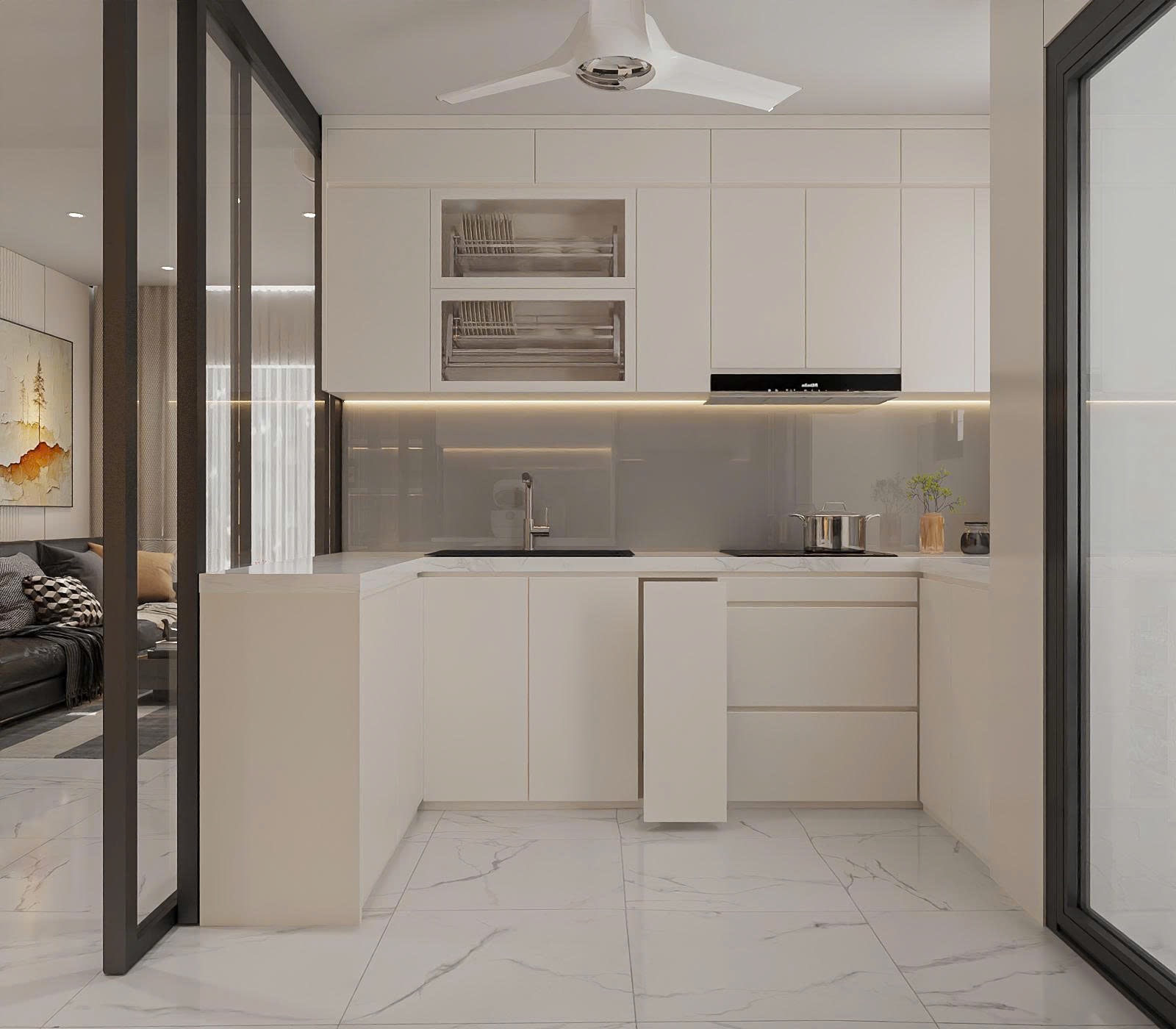 Khu vực bếp sử dụng hệ tủ chữ L hoặc chữ I kịch trần, tận dụng tối đa chiều cao để chứa đồ gia dụng, giúp mặt bếp luôn gọn gàng.