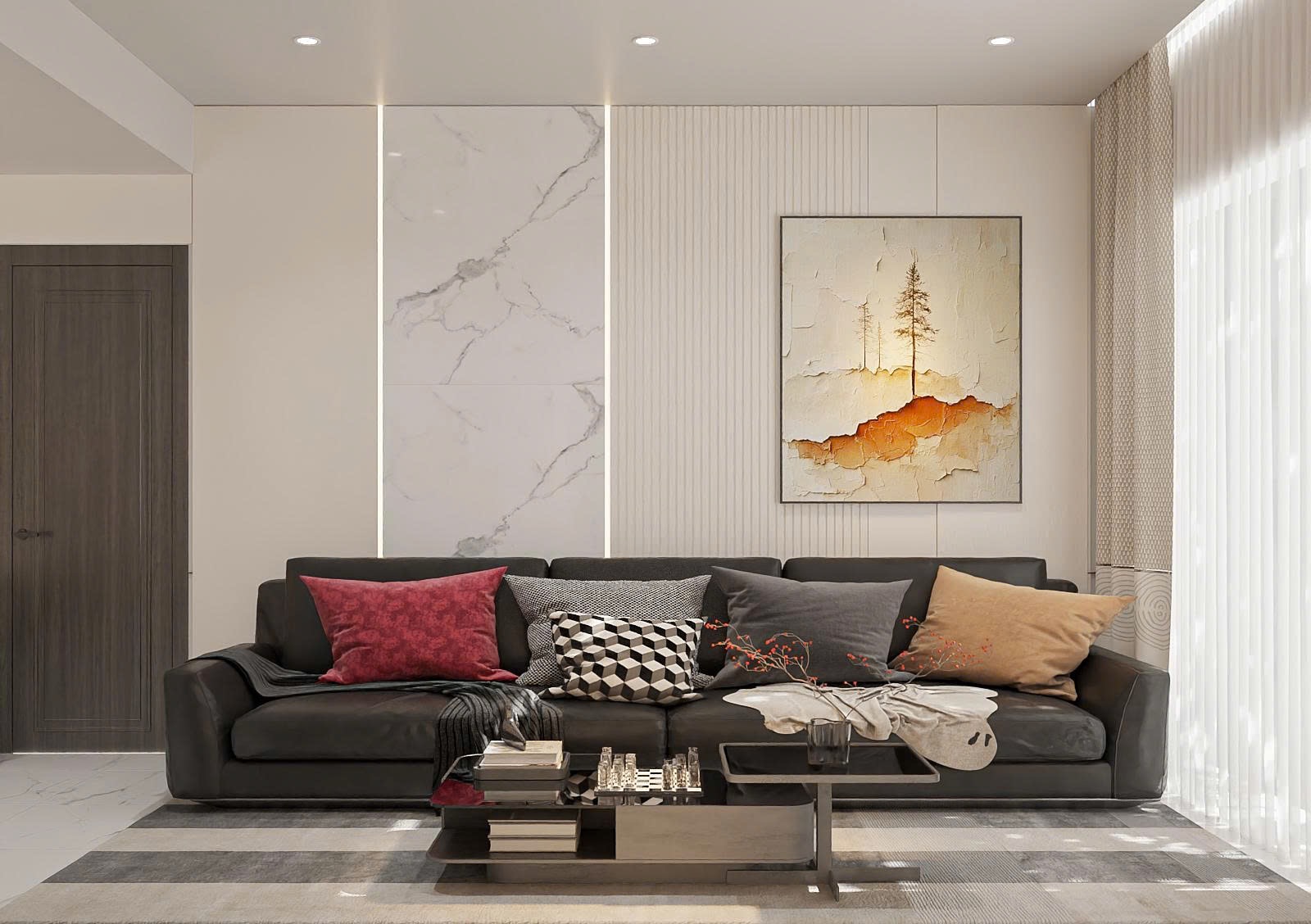 Phòng khách hiện đại với không gian mở giúp căn hộ 80m2 trở nên thoáng đãng.