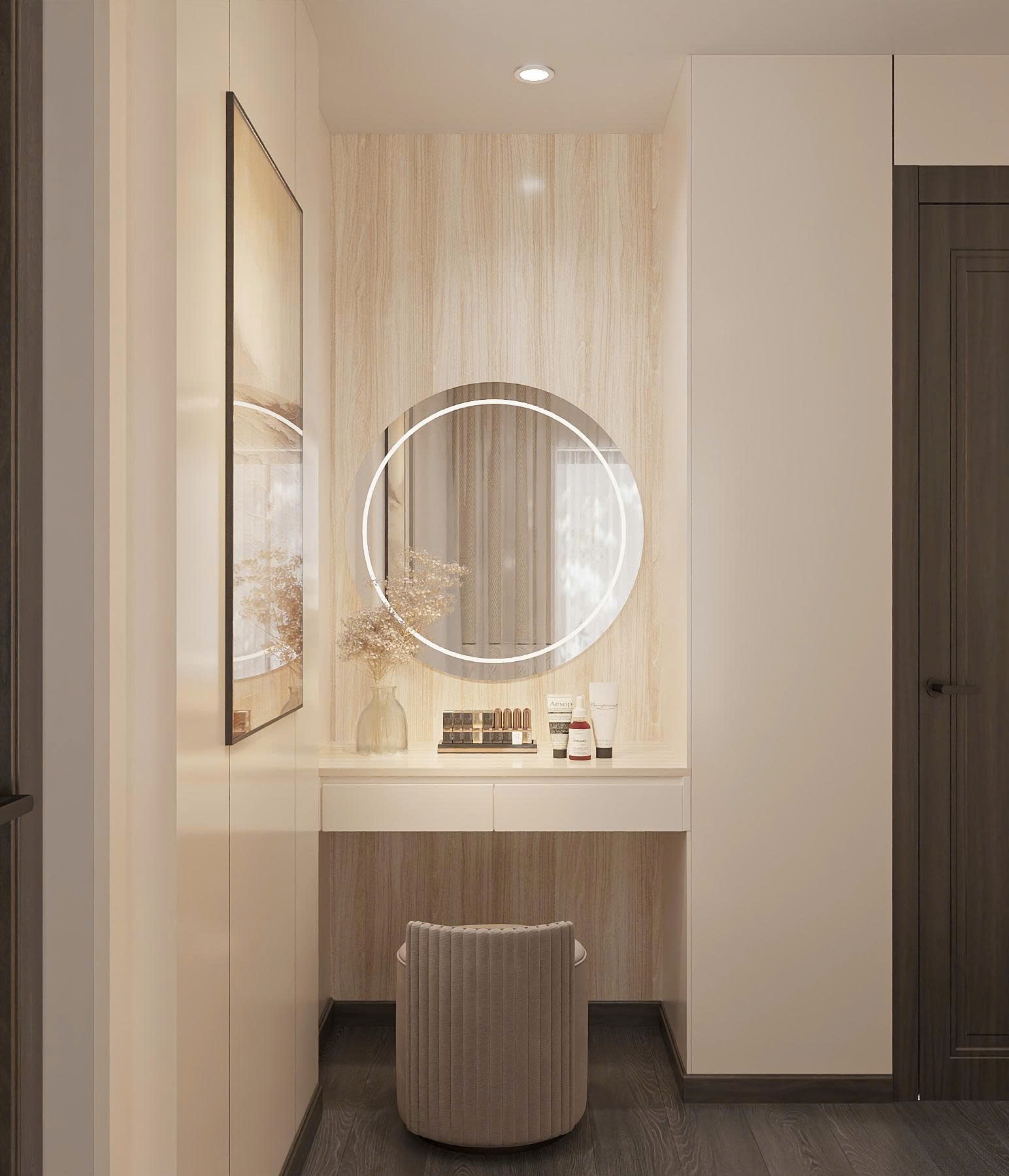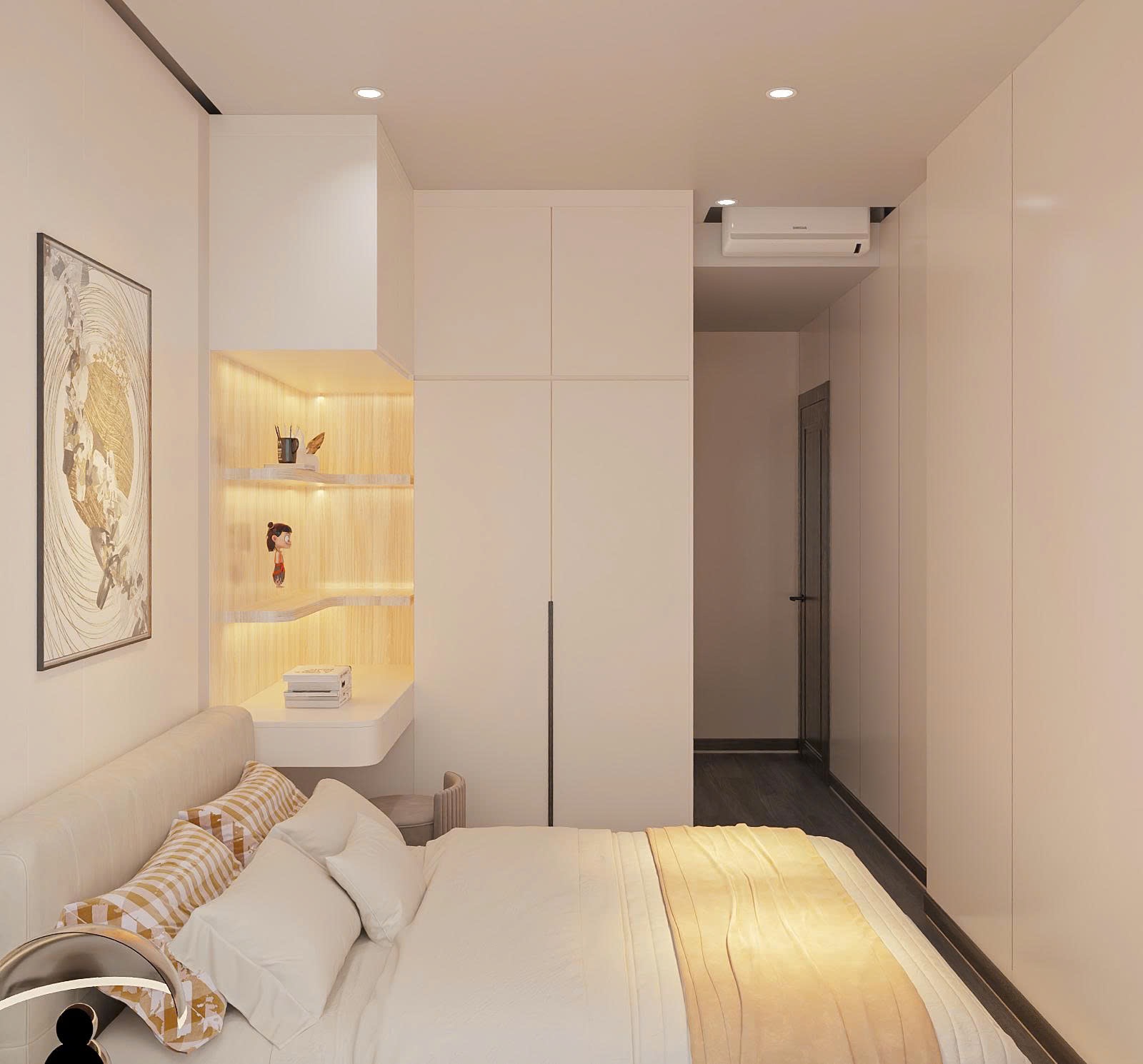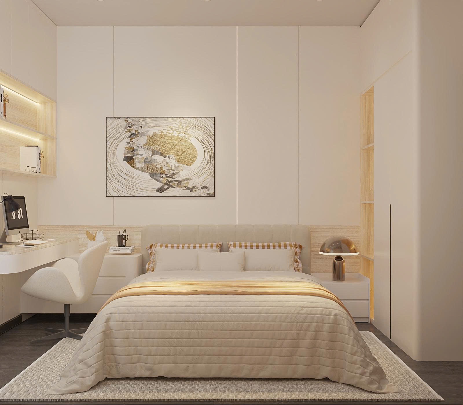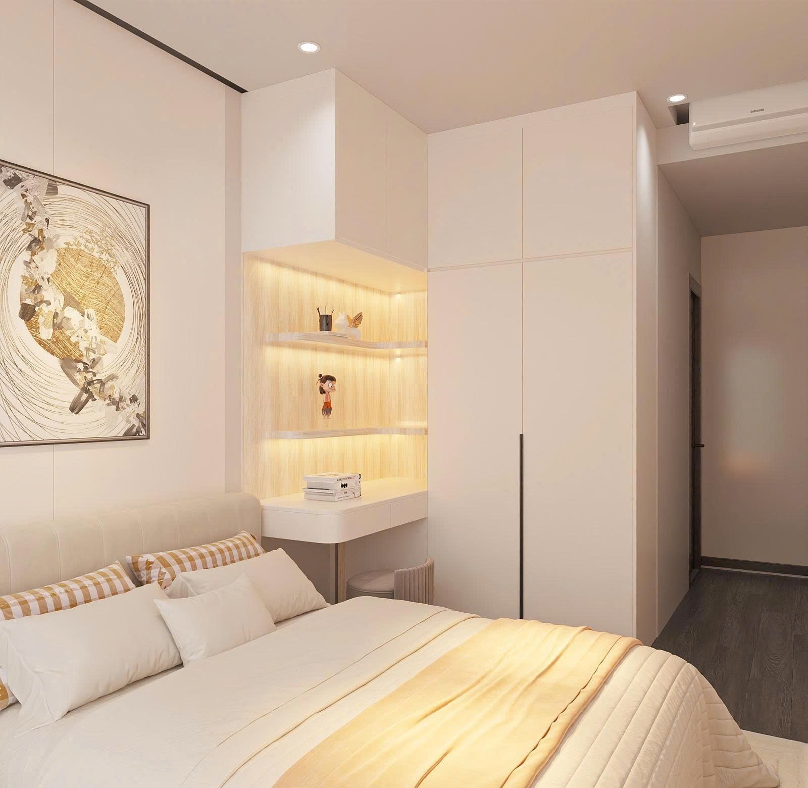 Dù diện tích hạn chế, phòng Master vẫn đầy đủ tiện nghi với giường bọc nỉ, tủ quần áo cánh kính hiện đại. TTB Home khéo léo bố trí bàn trang điểm treo tường để tiết kiệm diện tích sàn.