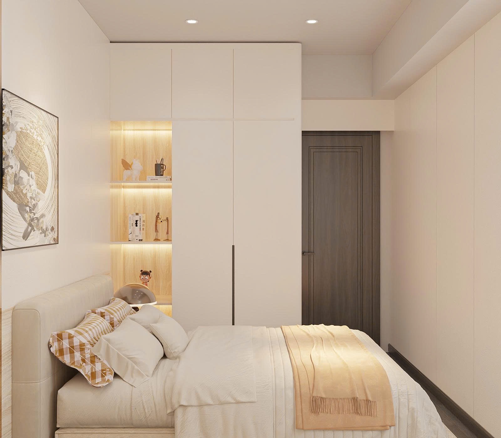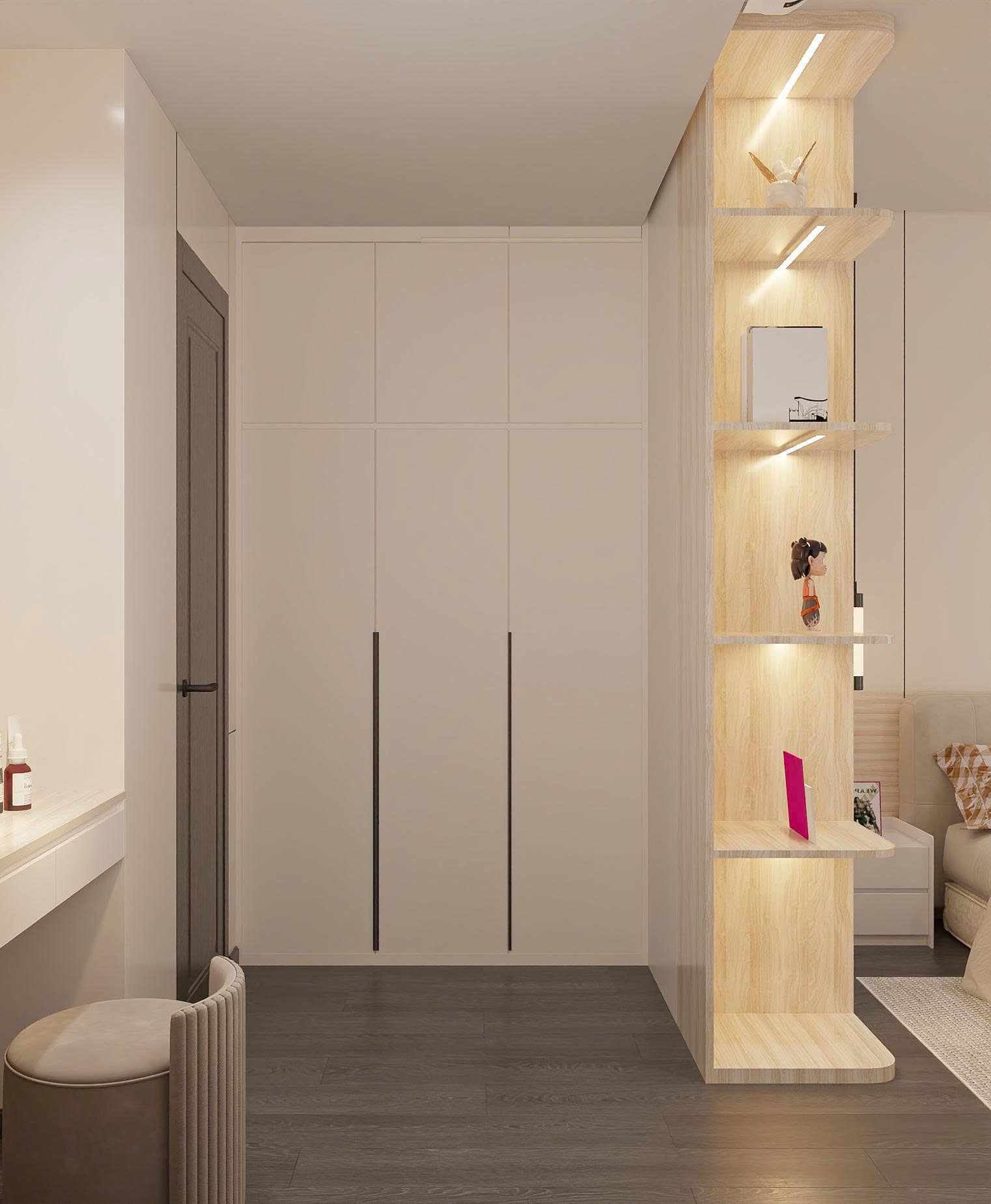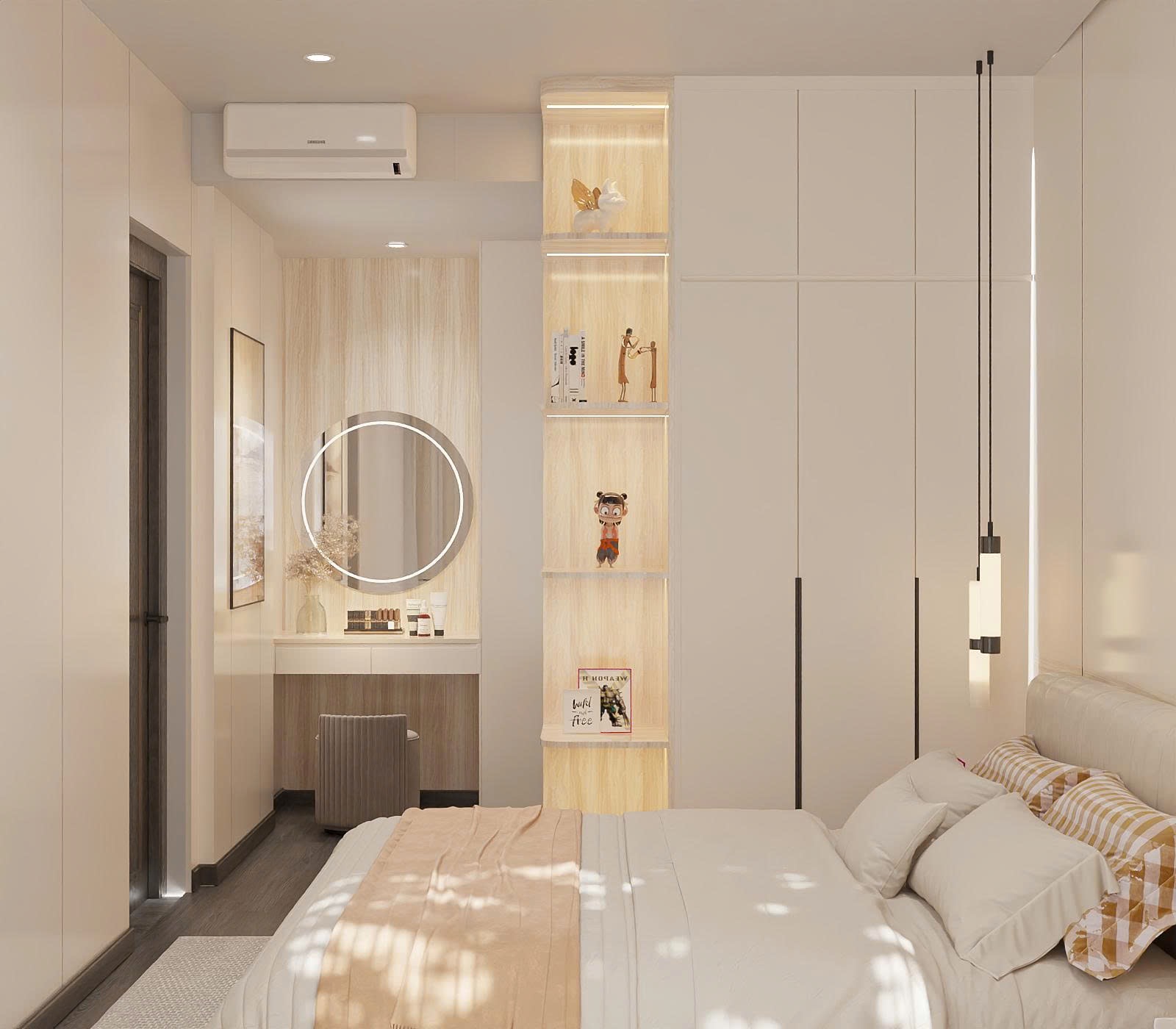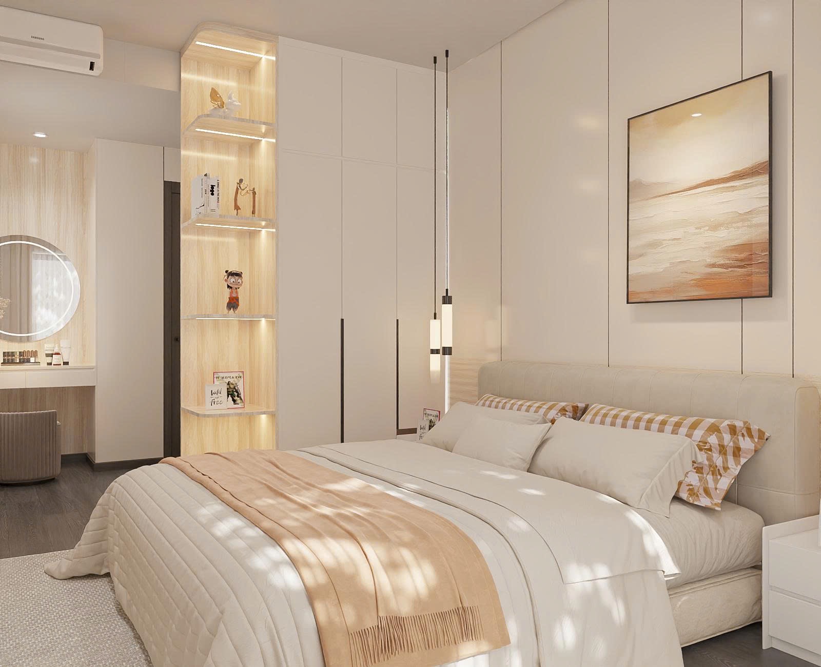 Dù diện tích hạn chế, phòng Master vẫn đầy đủ tiện nghi với giường bọc nỉ, tủ quần áo cánh kính hiện đại. TTB Home khéo léo bố trí bàn trang điểm treo tường để tiết kiệm diện tích sàn.