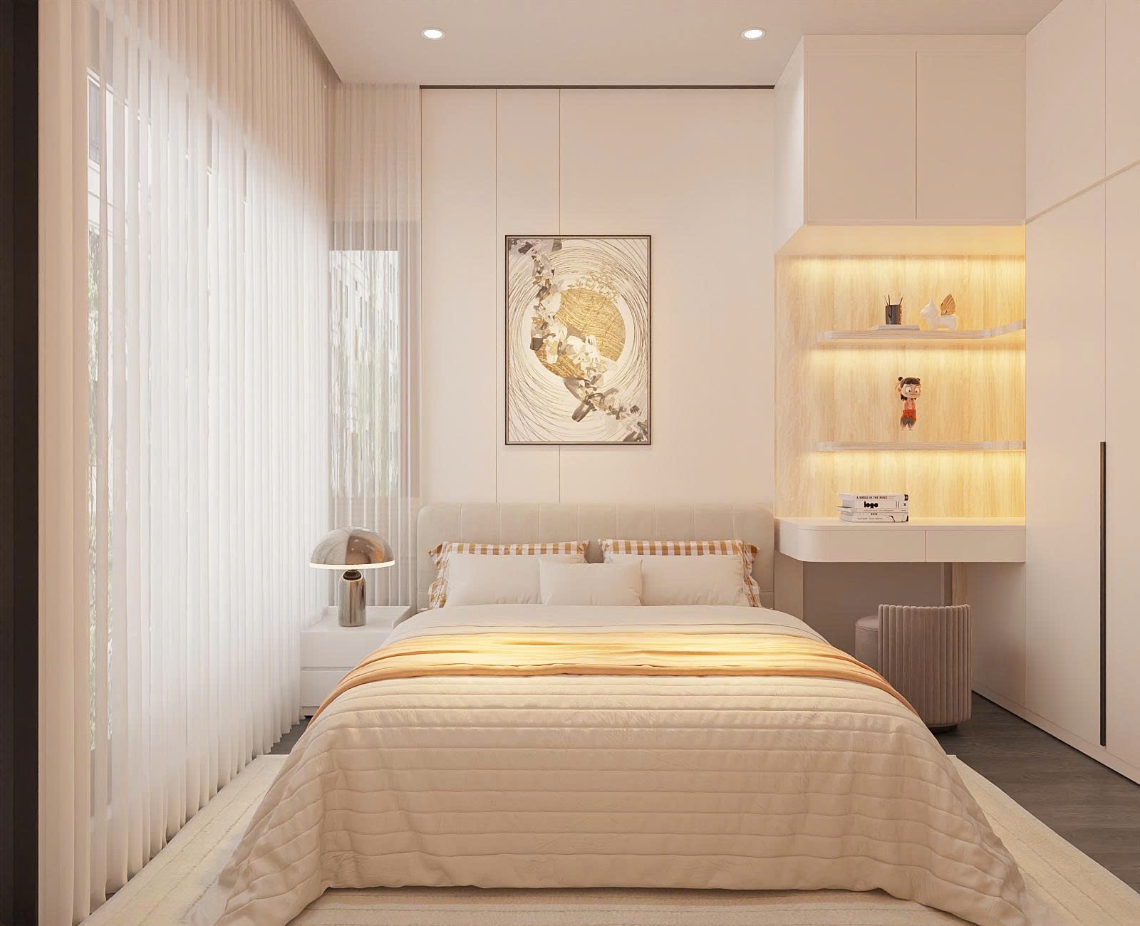 Đây là khu vực thể hiện rõ nhất sự sáng tạo của TTB Home. Với phòng ngủ cho bé, chúng tôi sử dụng giường tầng hoặc giường bục (giường kết hợp tủ quần áo bên dưới). Bàn học được bố trí cạnh cửa sổ để đón ánh sáng tự nhiên tốt nhất.